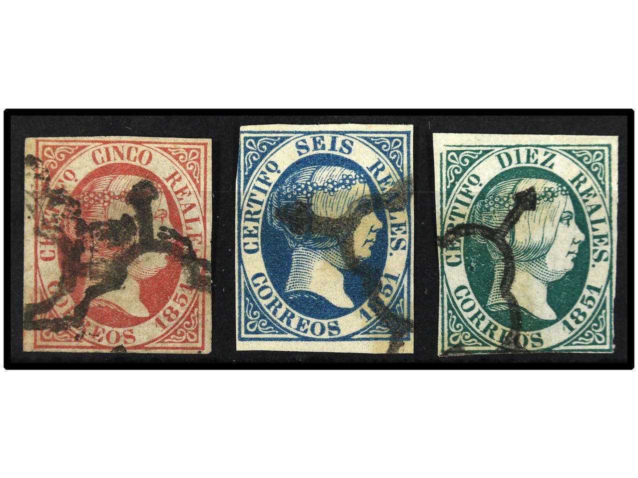 ESPAÑA. 5 reales rosa, 6 reales azul y 10 reales verde. Sellos de buen aspecto, algún defecto. Ed.9, 10, 11. Cat. 1.720€. (Image1)