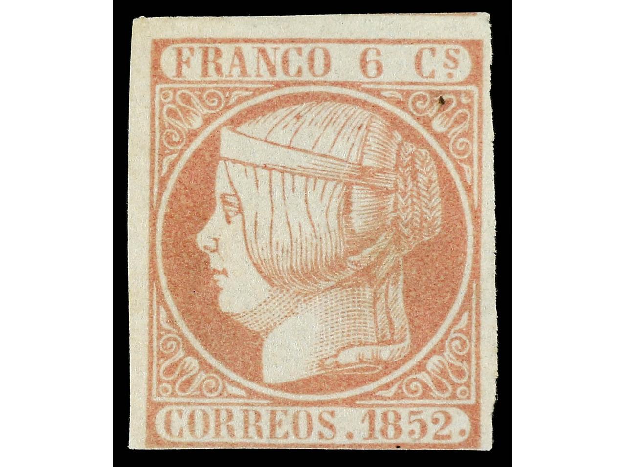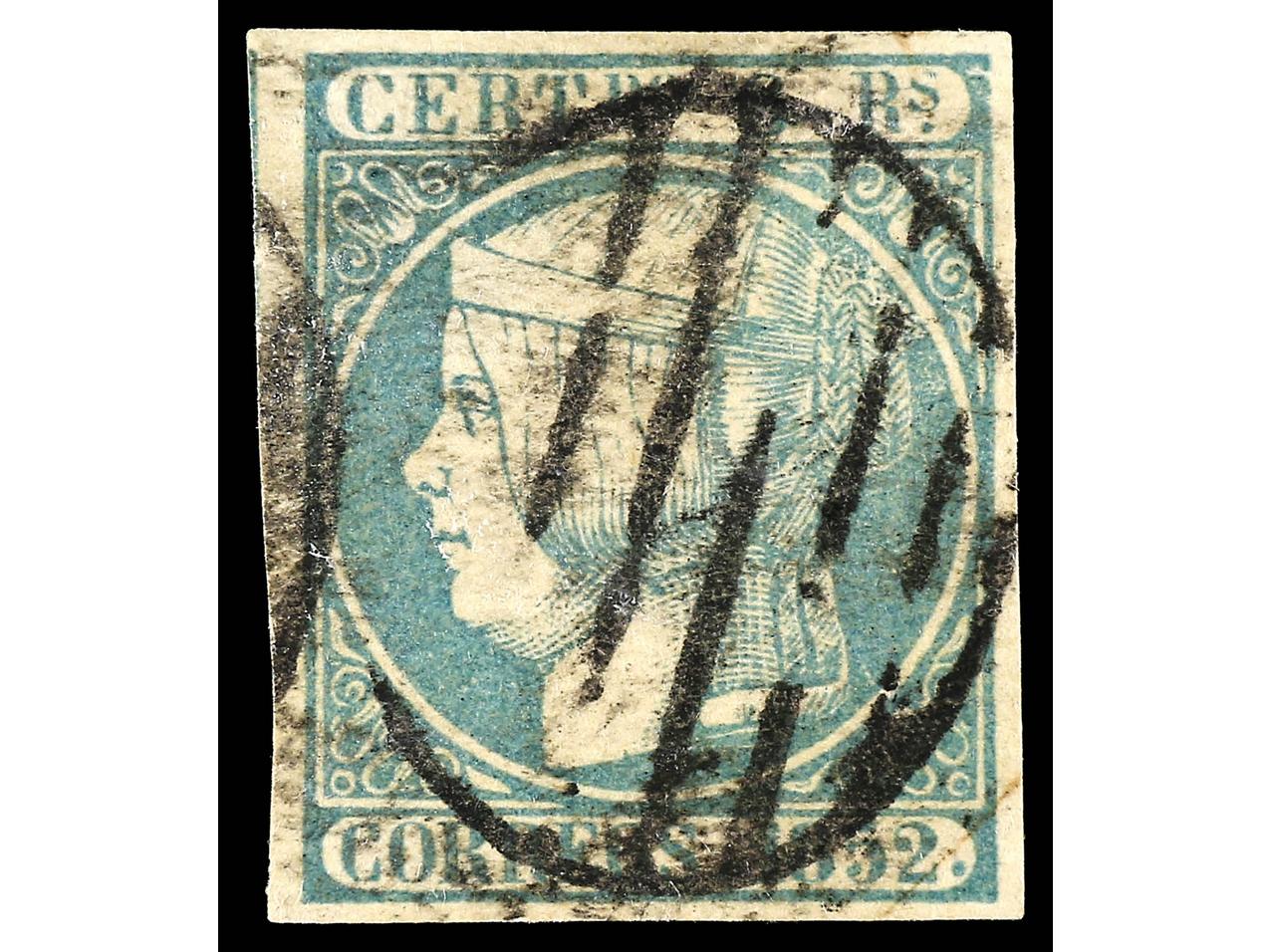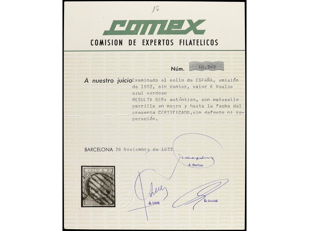 ESPAÑA. 6 reales azul verdoso. Amplios márgenes. Dictamen CEM. PRECIOSO. RARO. Ed.16. (Image1) (Image2)