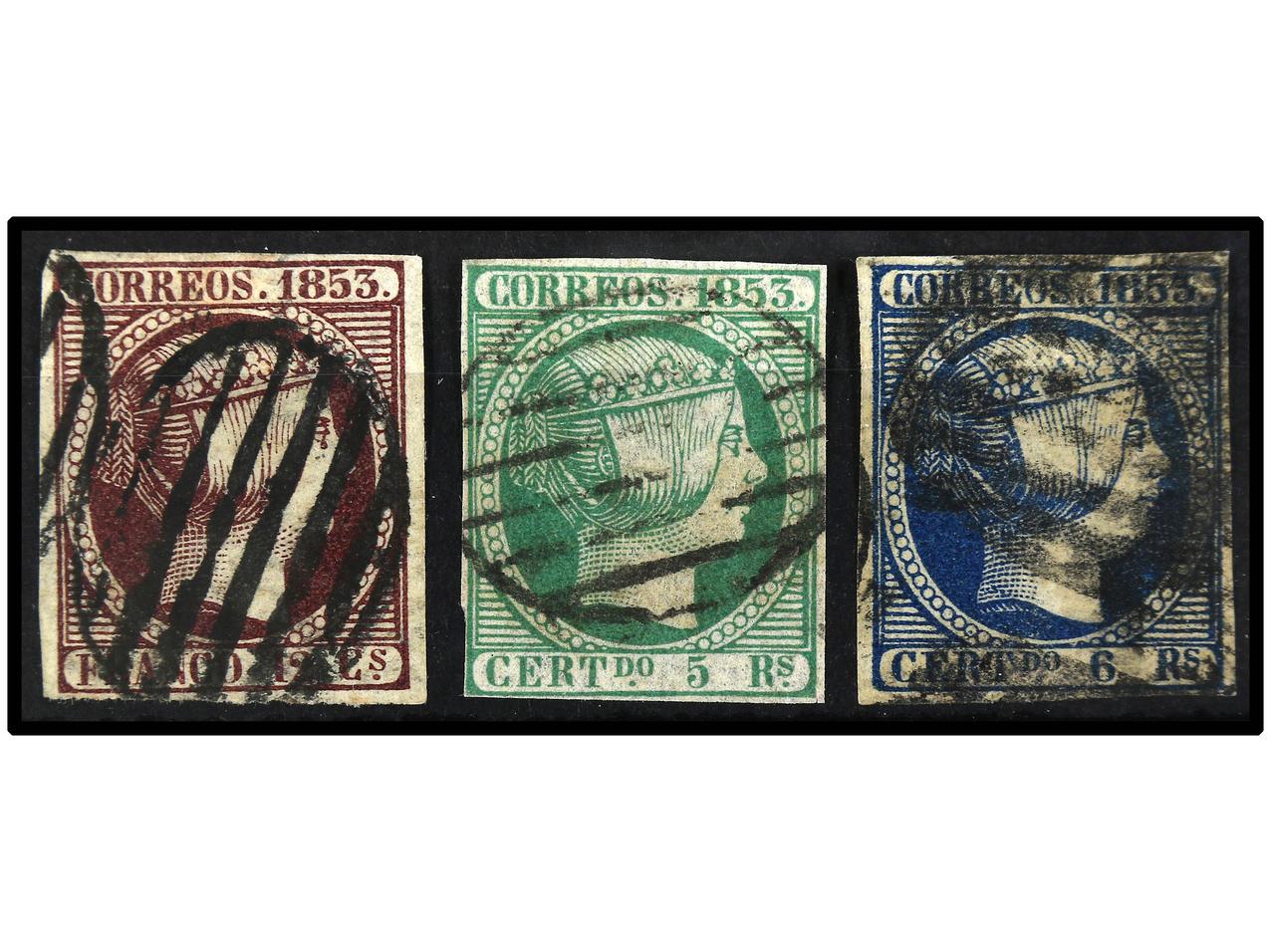 ESPAÑA. 12 cuartos lila, 5 reales verde y 6 reales azul. Defectos. Ed.18, 20, 21. Cat. 620€. (Image1)