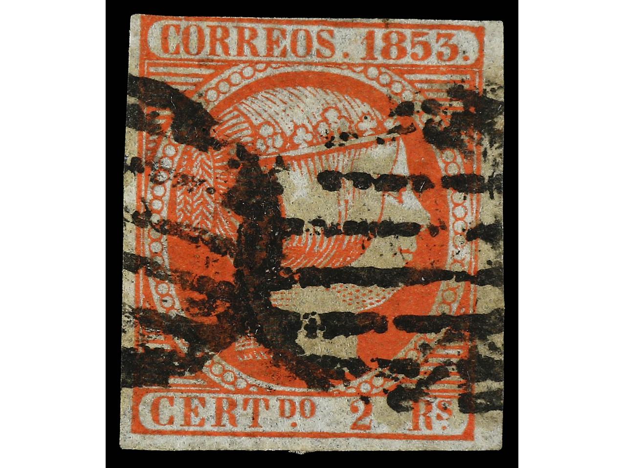 ESPAÑA. 2 reales bermellón, margen superior muy ajustado. Cert. EXFIMA. Ed.300. Cat. 3.000€. (Image1) (Image2)