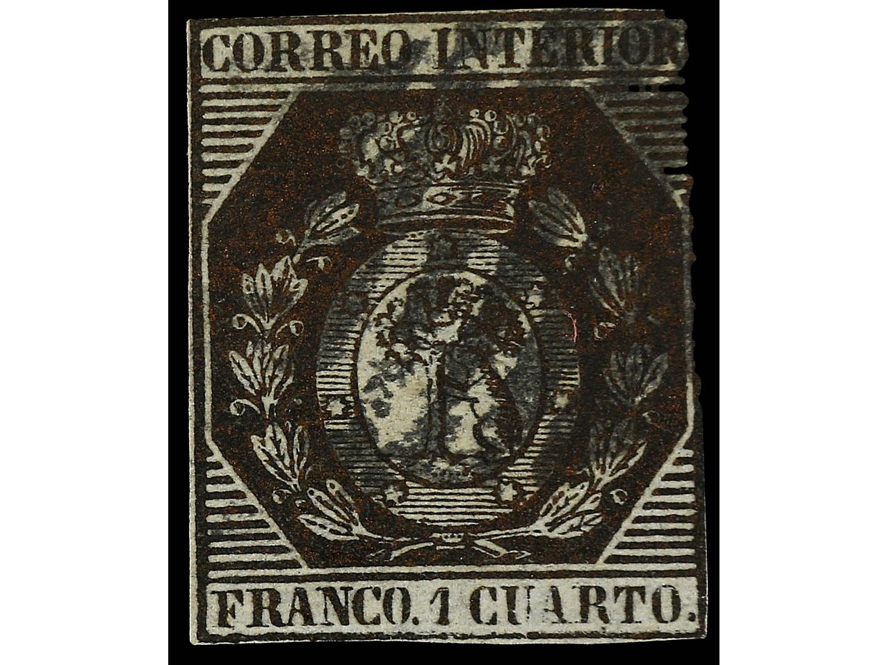 ESPAÑA. 1 cuarto bronce. Dos márgenes justos pero completos. Dictamen CEM. Ed.22. Cat. 2.200€. (Image1) (Image2)
