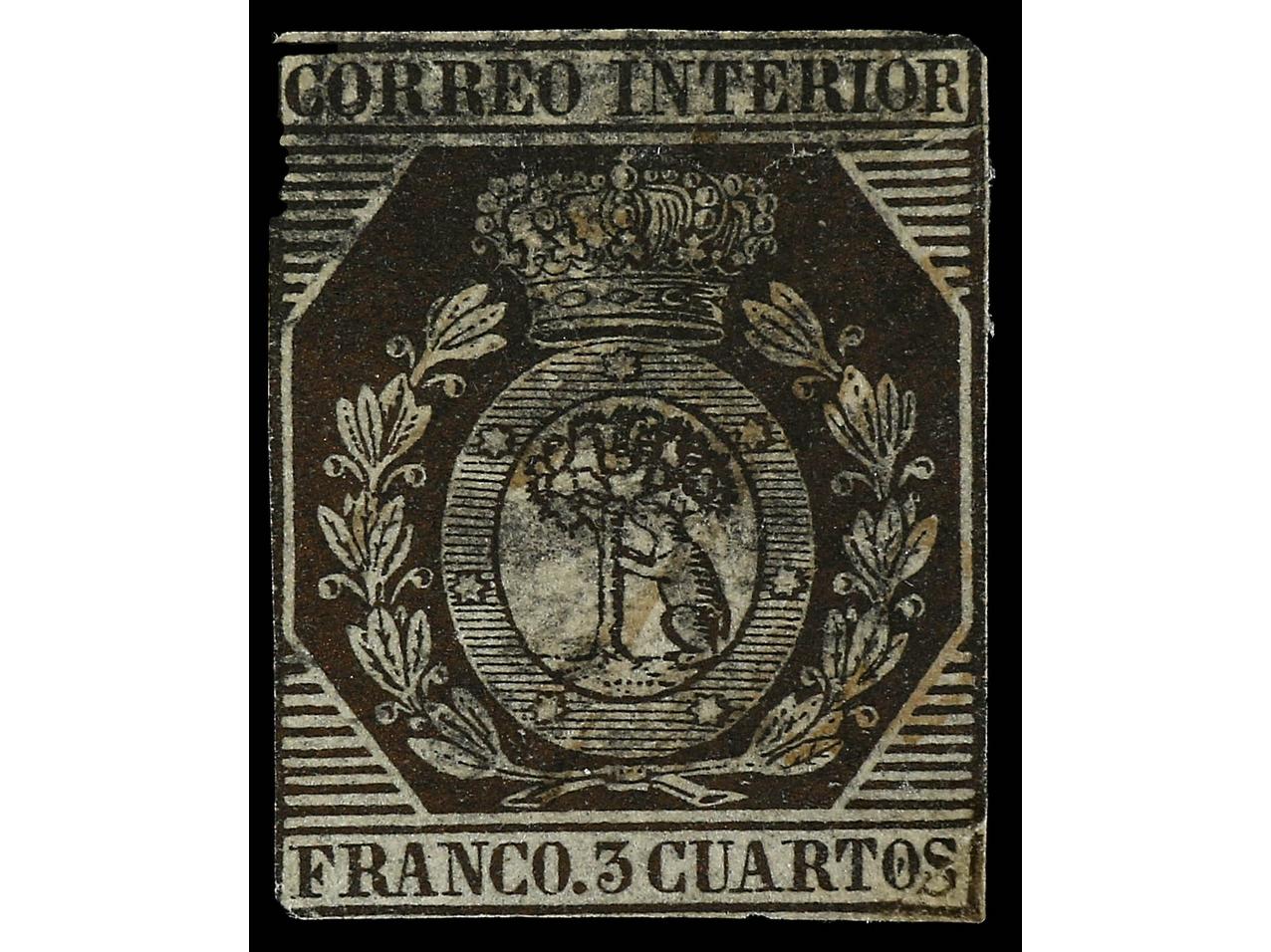 ESPAÑA. 3 cuartos bronce dorado, márgenes cortos. Oportunidad para adquirir este raro sello. Ed.23. Cat. 7.000€. (Image1)