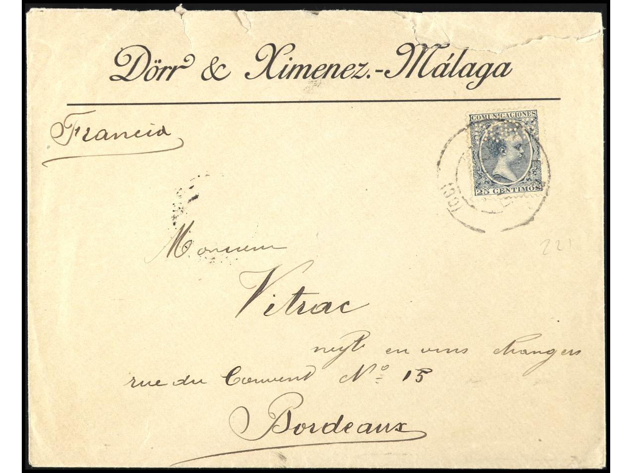 ESPAÑA. 25 cts. con perforación ´DORR´ circulada de MÁLAGA a BURDEOS. BONITA. Ed.221. (Image1)