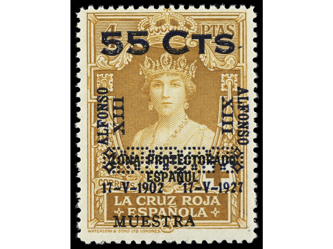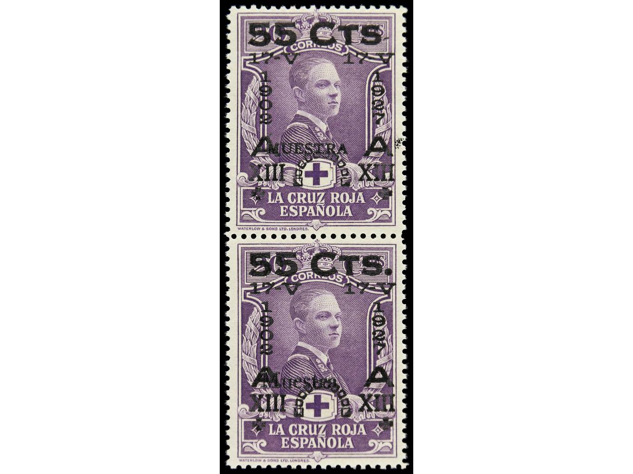 ESPAÑA. 55 cts. s. 20 cts. violeta. Pareja vertical con HABILITACIÓN ´MUESTRA´ y ´Muestra´. Ed.379M y Mb. Cat. 110€. (Image1)