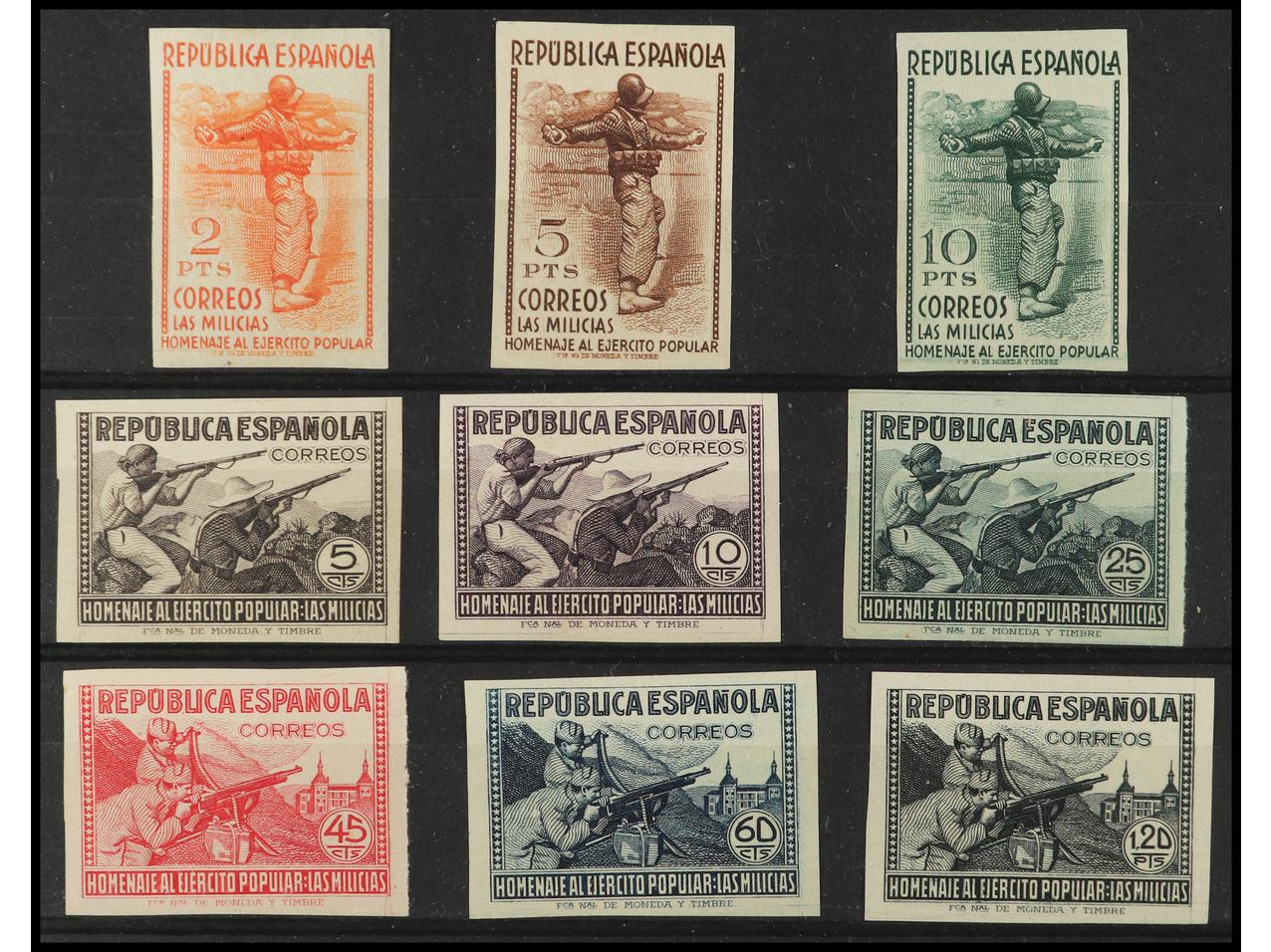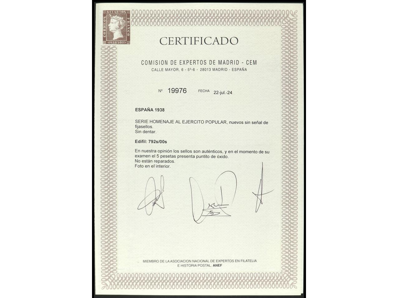 ESPAÑA. SERIE COMPLETA SIN DENTAR. Preciosa pese a un ínfimo punto de óxido en el 5 pts. Cert. CEM. MUY RARA. OCASIÓN. Ed.792s/800s. Cat. 3.050€.
