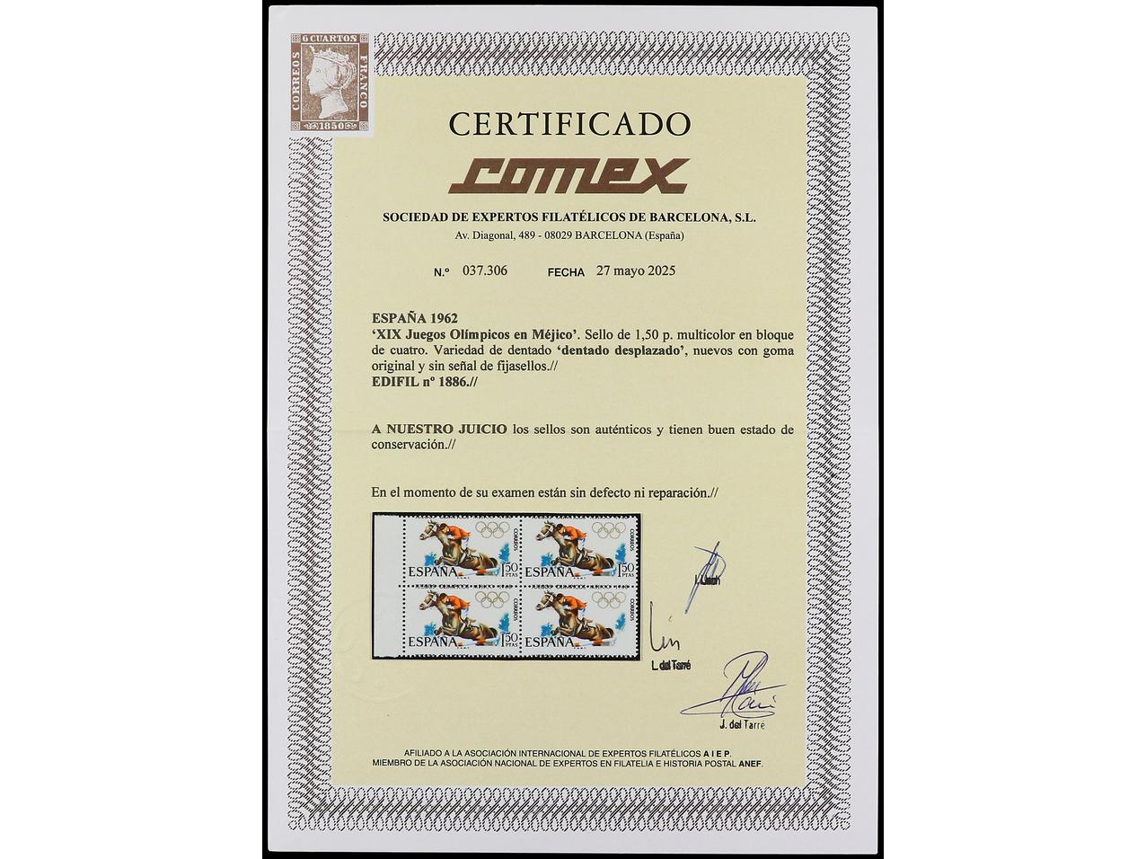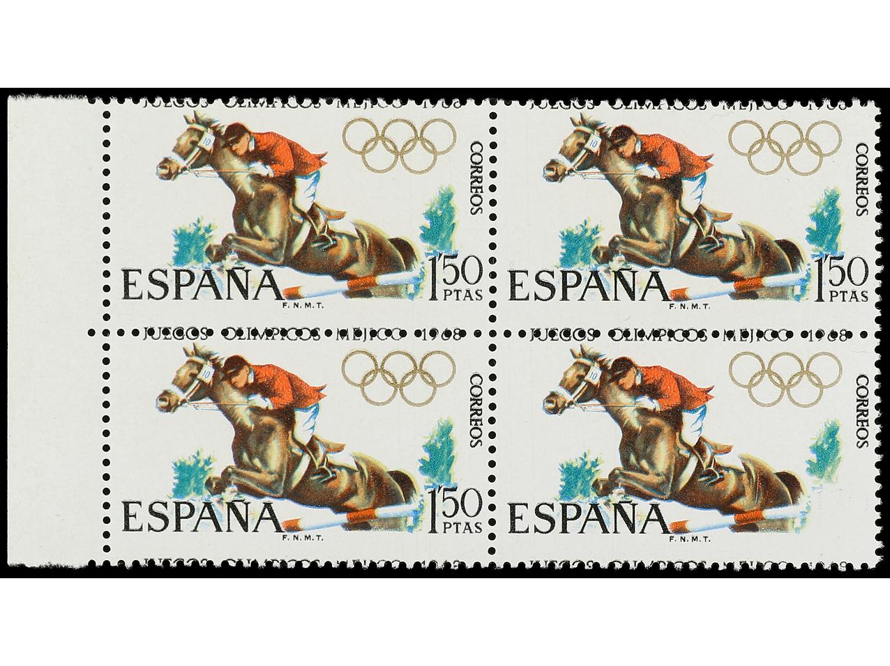 ESPAÑA. JUEGOS OLÍMPICOS DE MÉJICO. 1,50 pts. multicolor. Bloque de cuatro DENTADO DESPLAZADO. El 4º sello con facial omitido posiblemente tratado químicamente. Cert. COMEX. A EXAMINAR. Ed.1886 (4). (Image1) (Image2)
