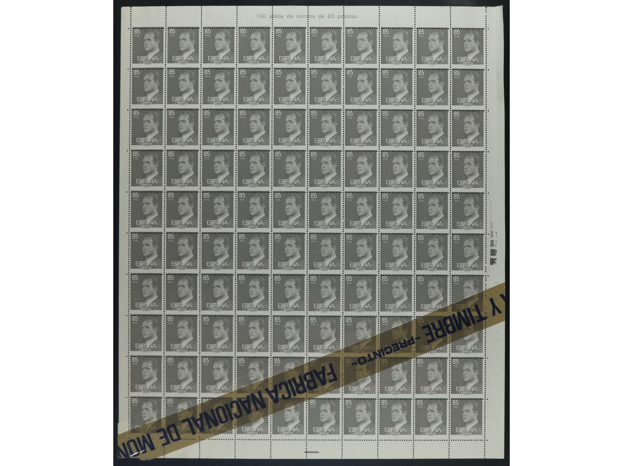 ESPAÑA. JUAN CARLOS I. 85 pts. gris. Pliego completo con EMPALME DE BOBINAS DIAGONAL que afecta a 16 sellos con el precinto de la Fabrica Nacional sobre ellos. PRECIOSO. MUY RARO. Ed.2604x. (Image1)