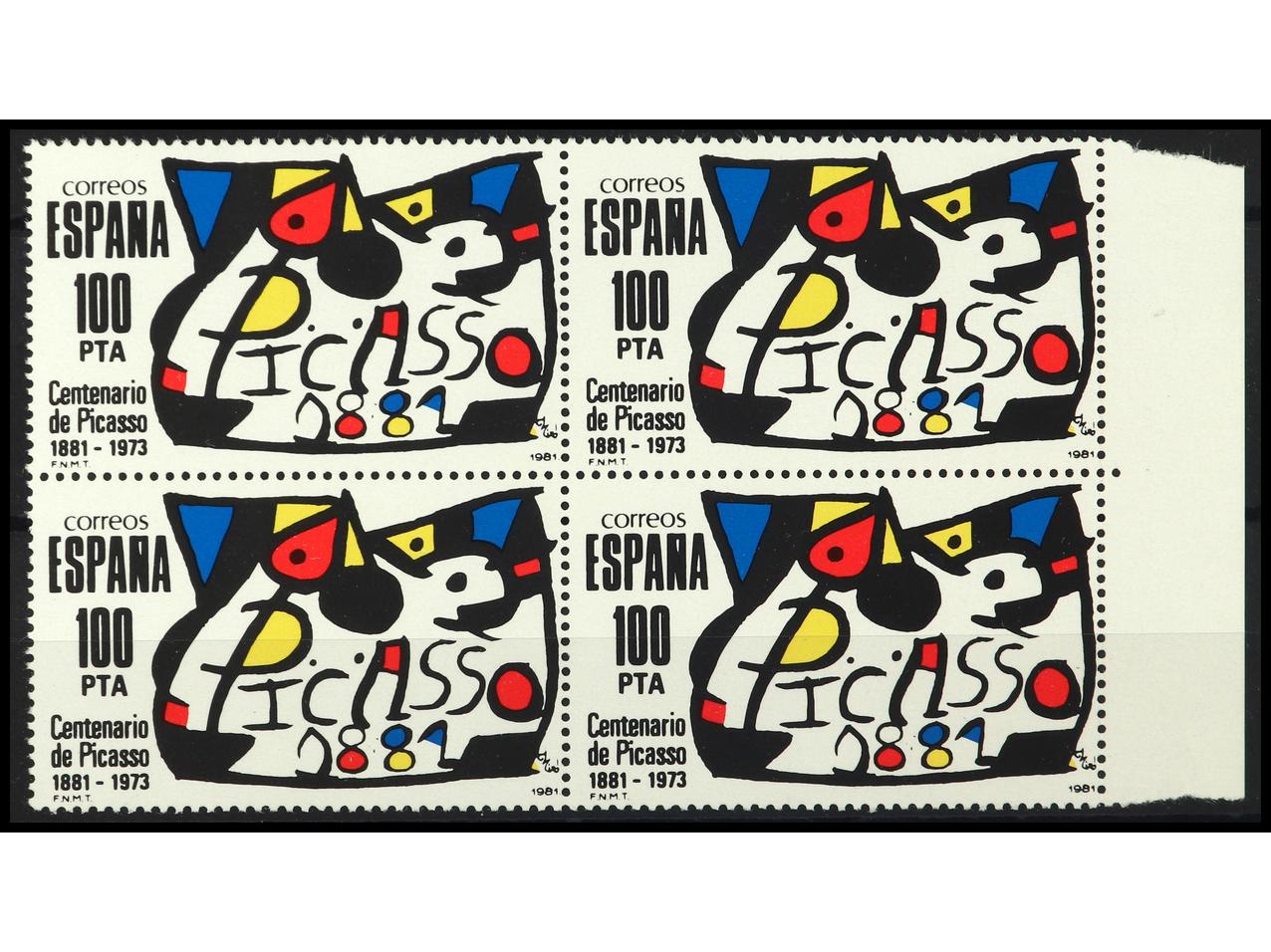 ESPAÑA. PICASSO. 100 pts. en bloque de 4. FALSO POSTAL. Borde de hoja. Ed.2609F(4). (Image1)