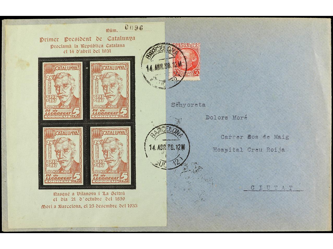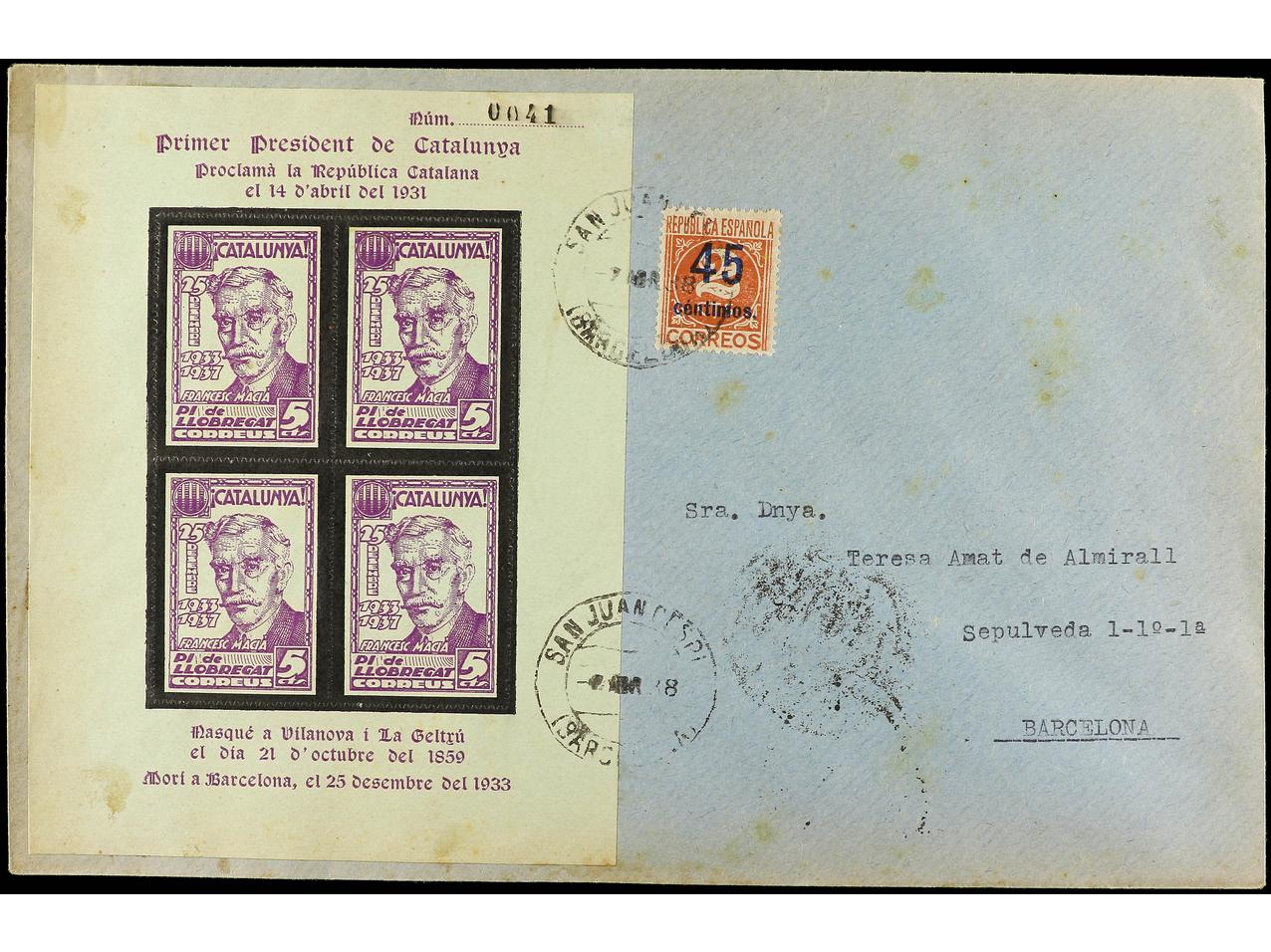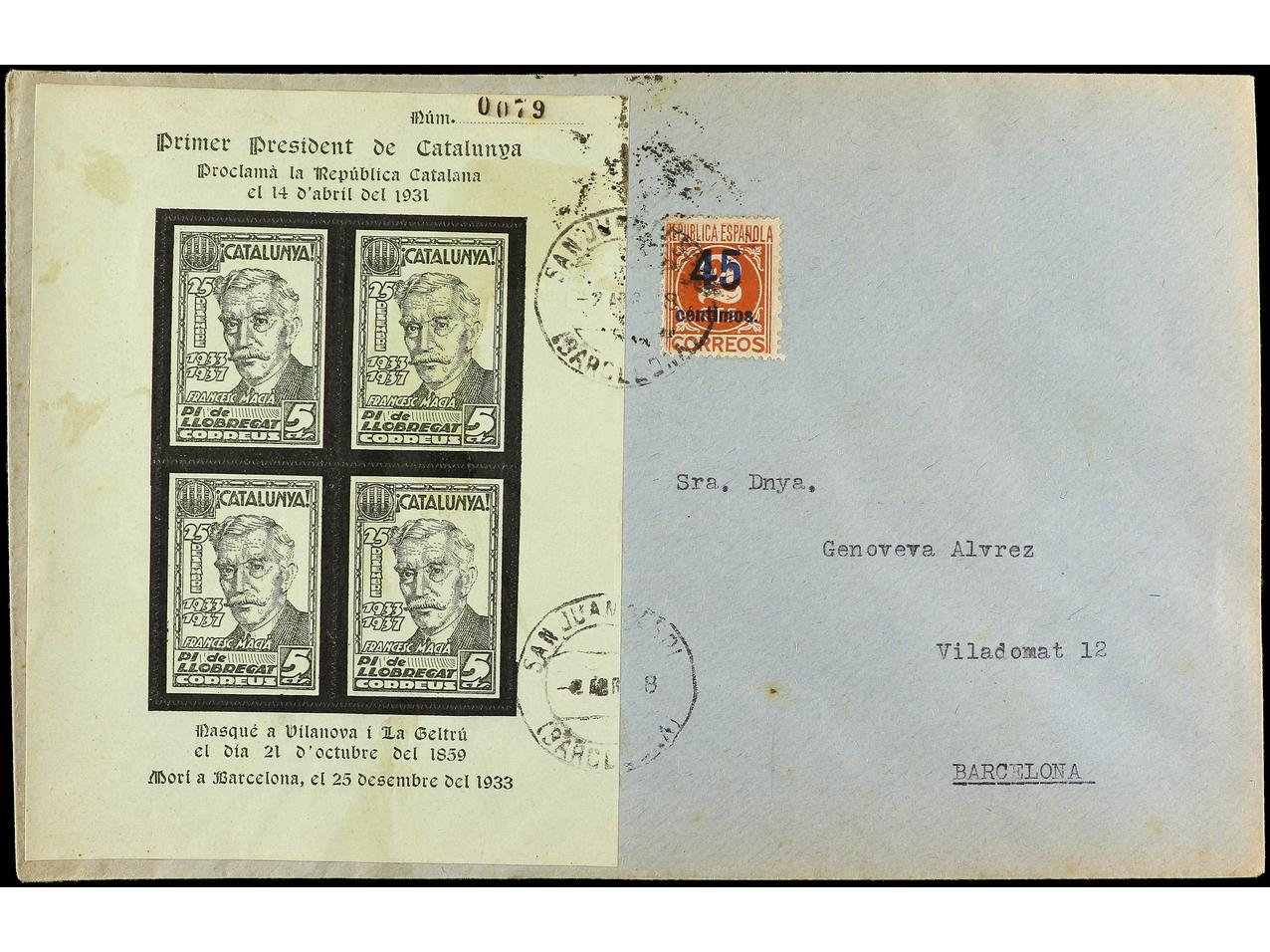 ESPAÑA GUERRA CIVIL. 1938. ZONA REPUBLICANA. PI DE LLOBREGAT. A BARCELONA, franqueada con las 4 hojitas bloques más sellos republicanos. Al dorso llegada. MUY RARAS. G.G 1029/32. (Image1) (Image2)