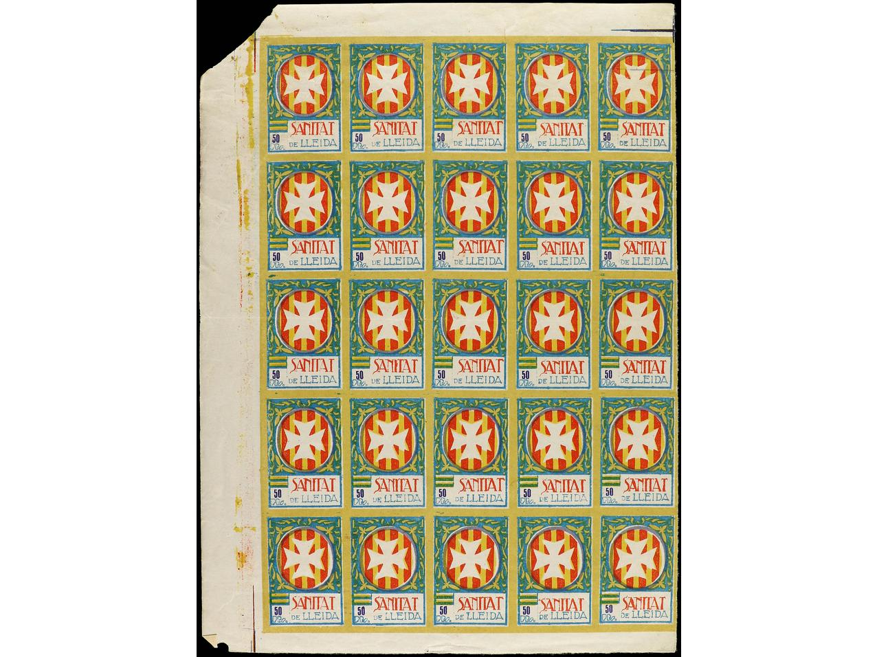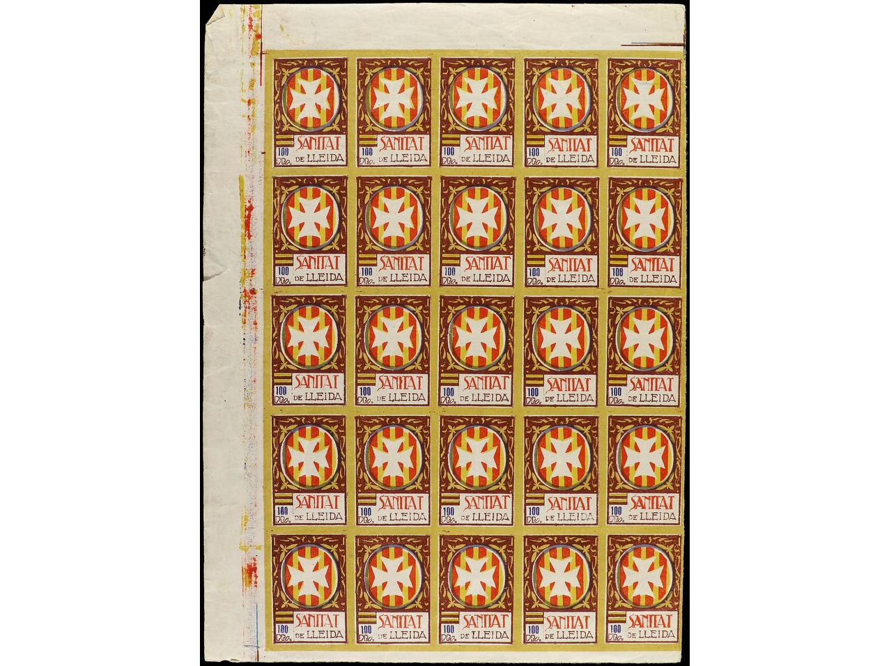 ESPAÑA GUERRA CIVIL. LLEIDA. 50 y 100 pts. Bloques de 25 SIN DENTAR. Algunas dobleces. RAROS. A EXAMINAR. Foto en web. GG.804 y 805. (Image1) (Image2)