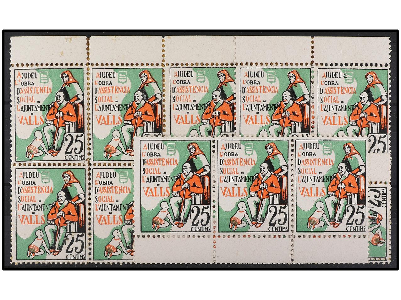 ESPAÑA GUERRA CIVIL. VALLS. 25 cts. rojo, verde y negro. 27 sellos en bloques. Allepuz 3. (Image1)