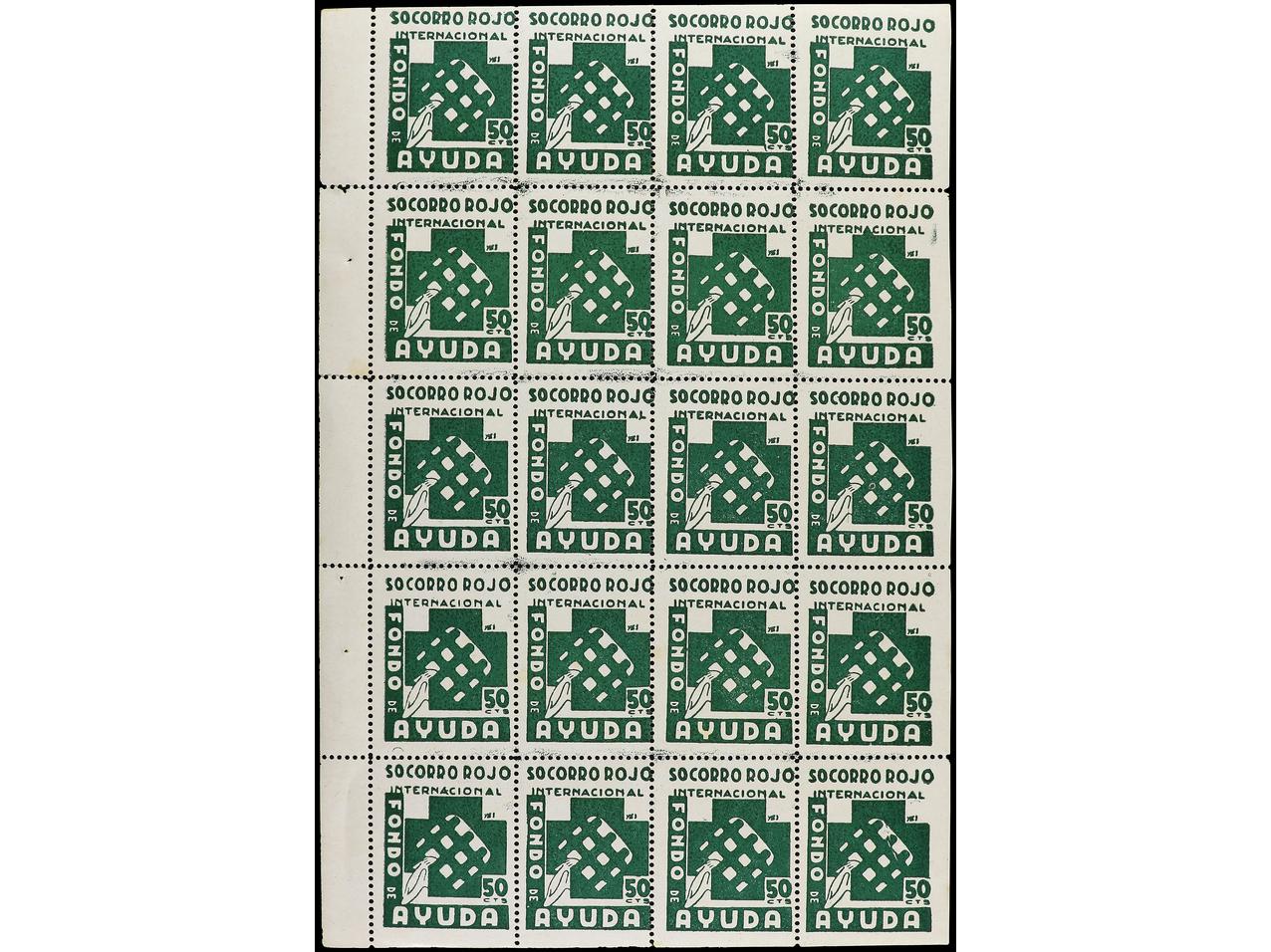 ESPAÑA GUERRA CIVIL. ZONA REPUBLICANA. VIÑETAS POLÍTICAS. SOCORRO ROJO INTERNACIONAL. Fondo de Ayuda. 50 cts. verde. Hoja completa de 20 ejemplares. MUY RARA. Afinet 20. G.G. 1542 (20). (Image1)