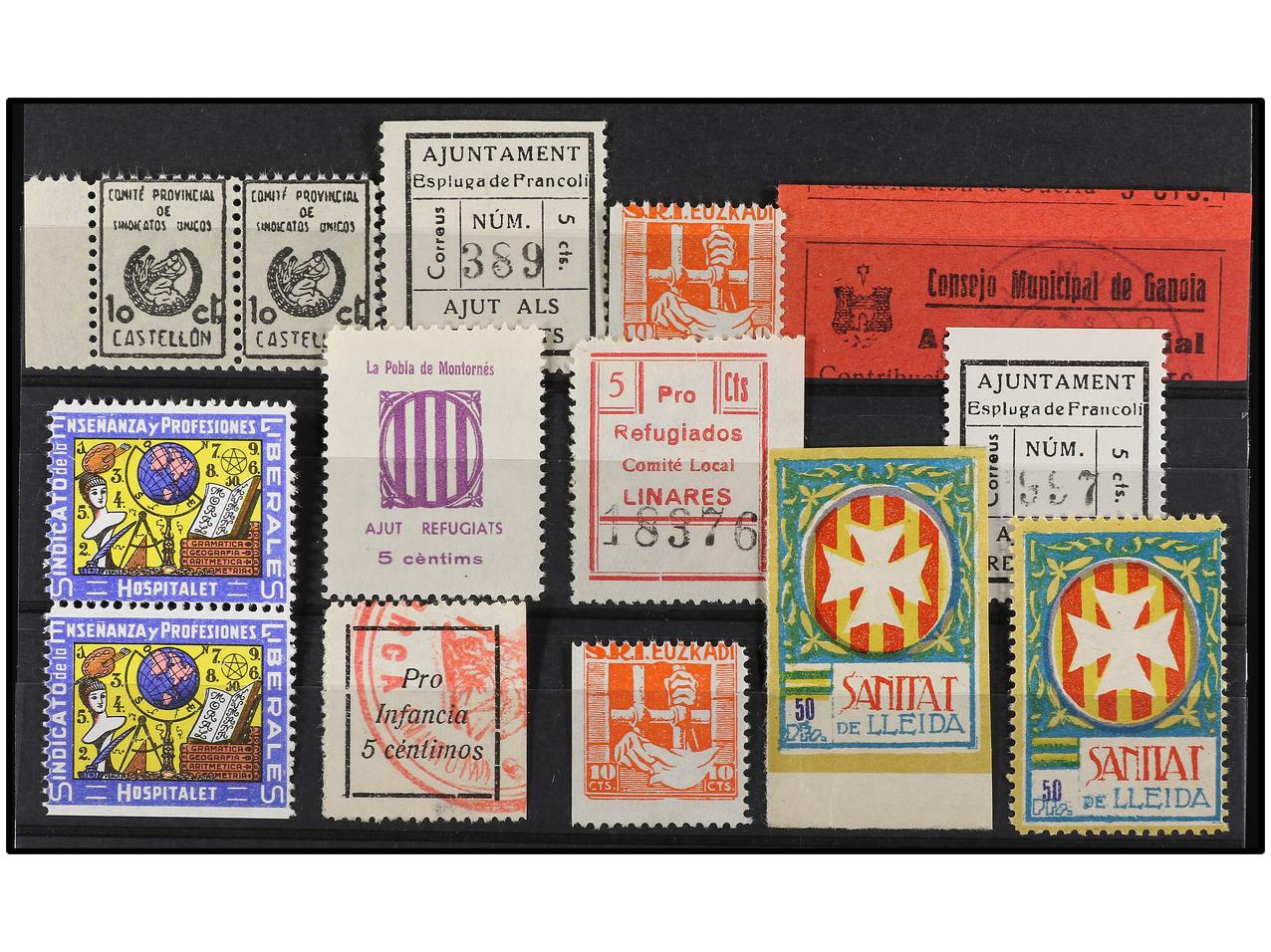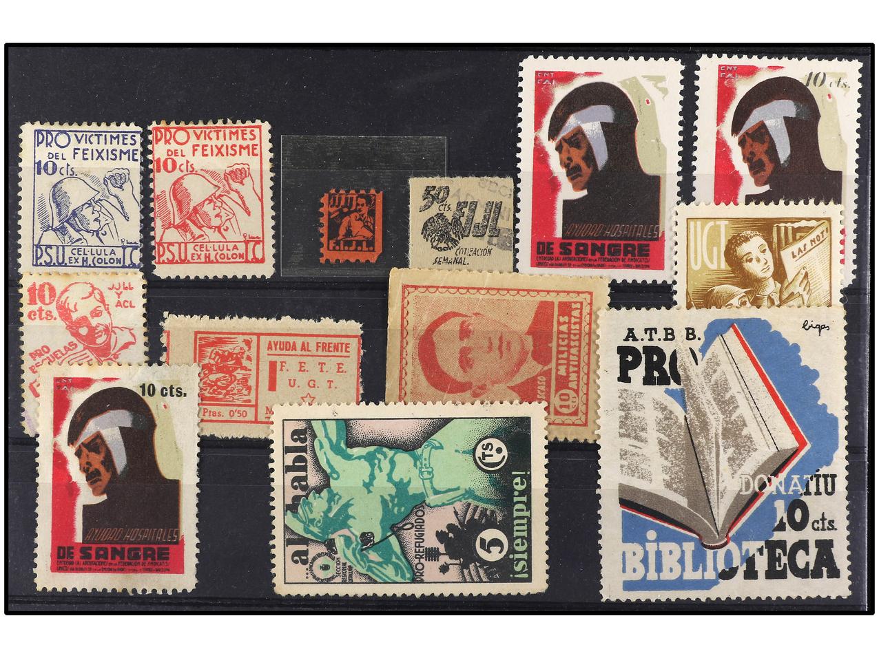 ESPAÑA GUERRA CIVIL. CONJUNTO montado en fichas formado por 14 viñetas, mayoría en nuevo y 1 carnet. A EXAMINAR. (Image1) (Image2)