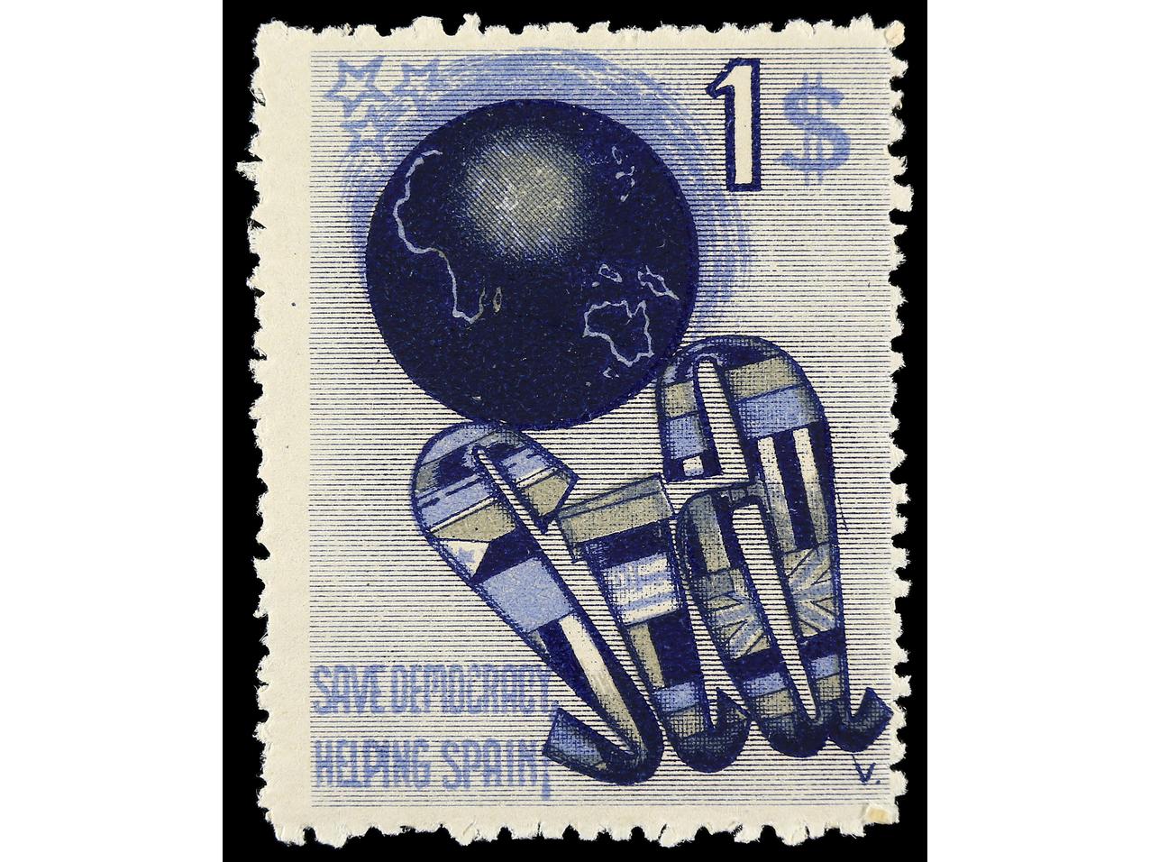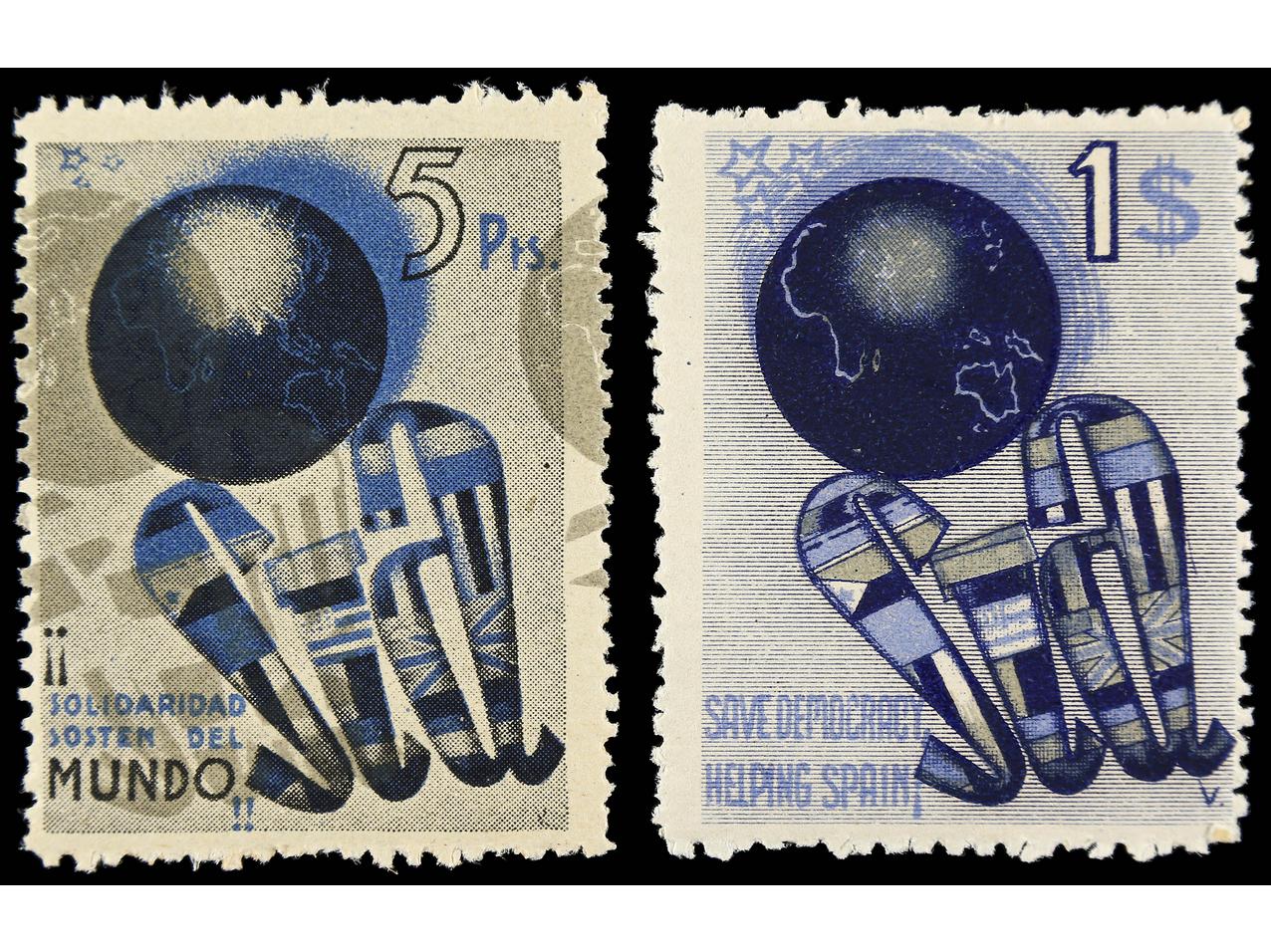 ESPAÑA GUERRA CIVIL. VIÑETAS POLÍTICAS. SIA. SOLIDARIDAD. 5 pts. color gris muy desplazado (GG 1621, Af. 134id) y 1$ SAVE DEMOCRACY HELPING SPAIN (similar a GG 1623, Af. 138). MUY RARO. (Image1) (Image2)