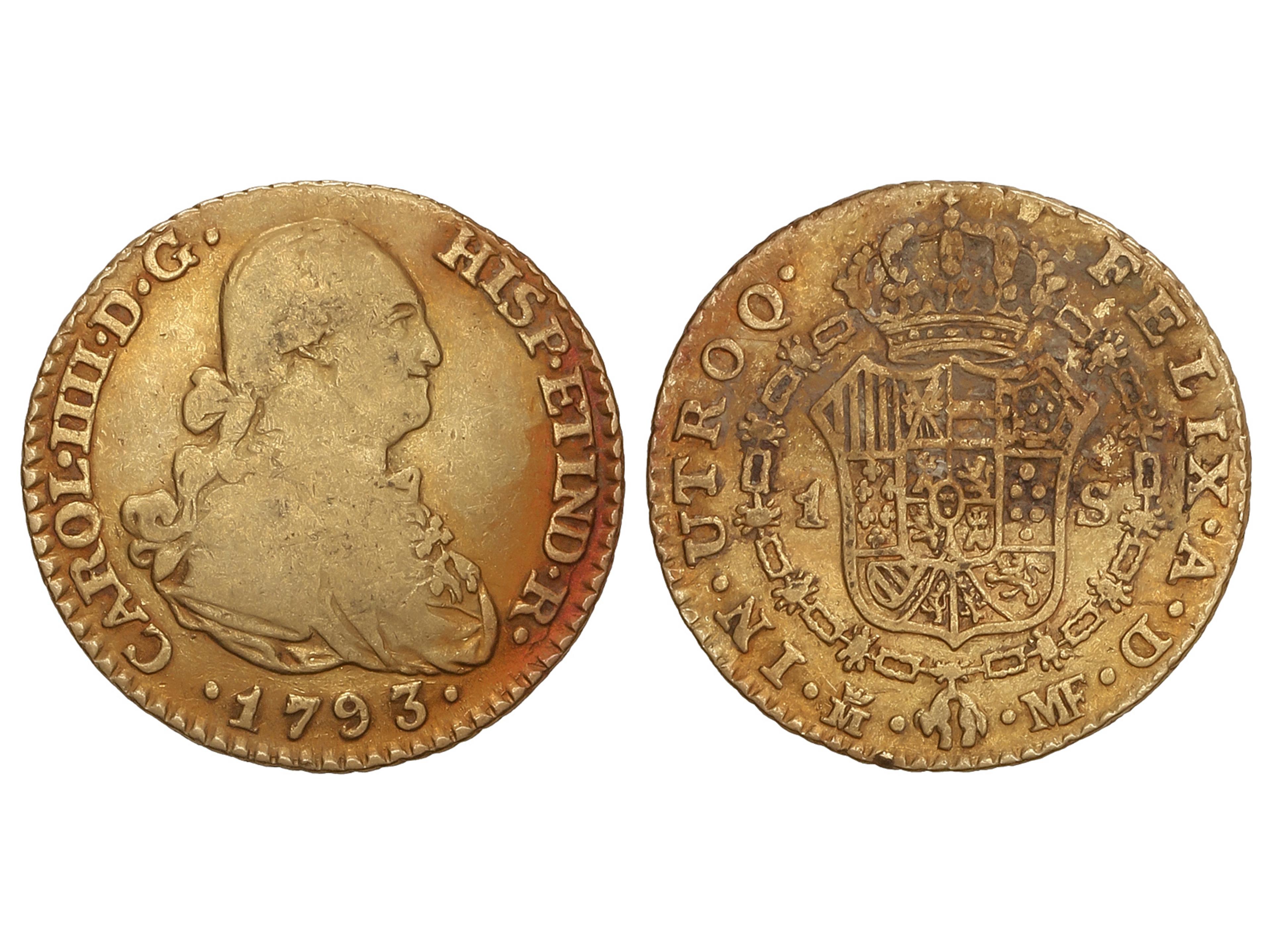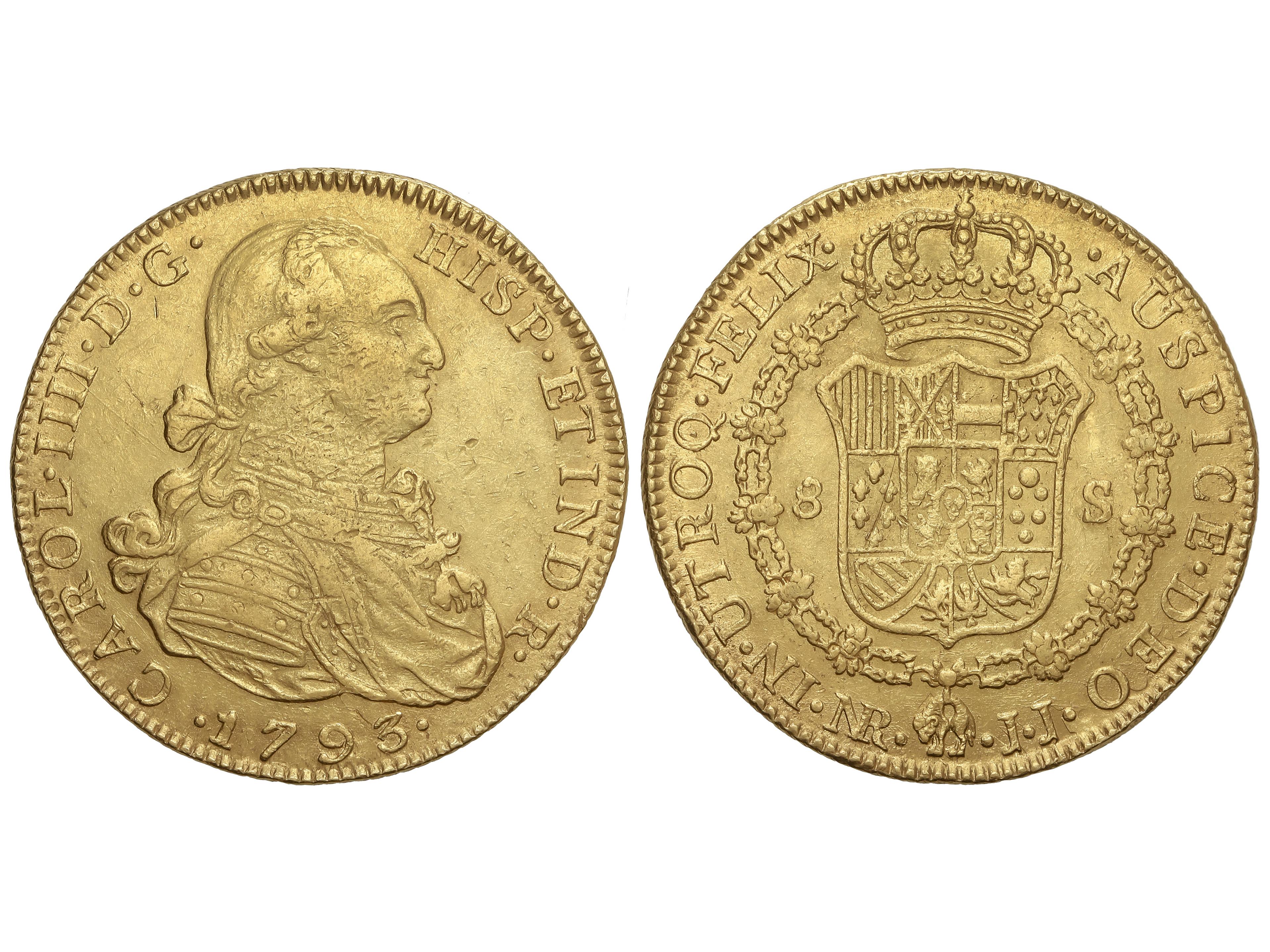 escudos. 1793. NUEVO REINO. J.J. 26,96 grs. (Descolgada, golpecitos). AC-1723; XC-1123. MBC. (Image1)