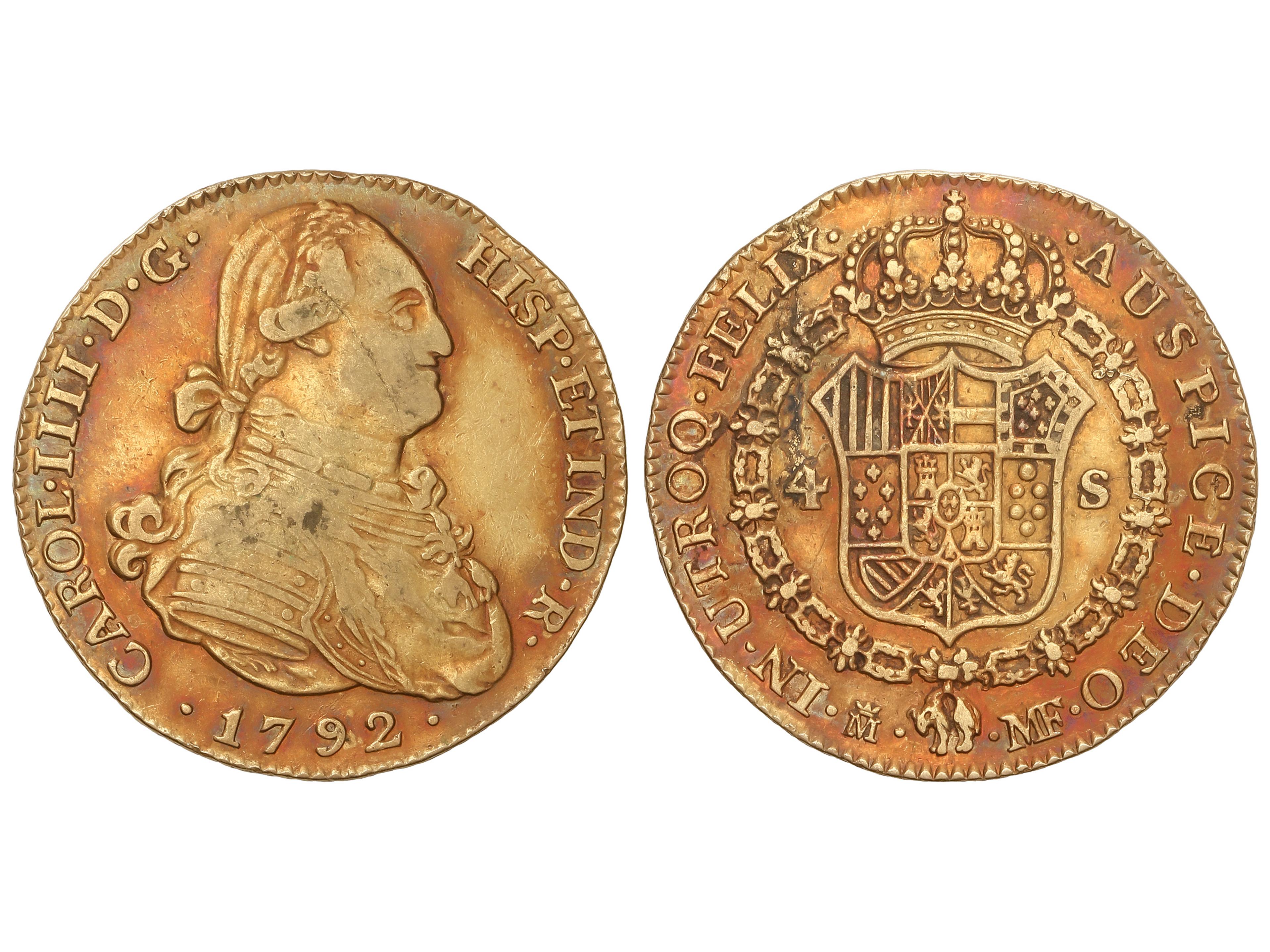 Escudos. 1792. MADRID. M.F. 13,39 grs. (Cordoncillo irregular a las 12h, probablemente descolgada). Pátina irisada irregular. AC-1475. MBC-/MBC. (Image1)