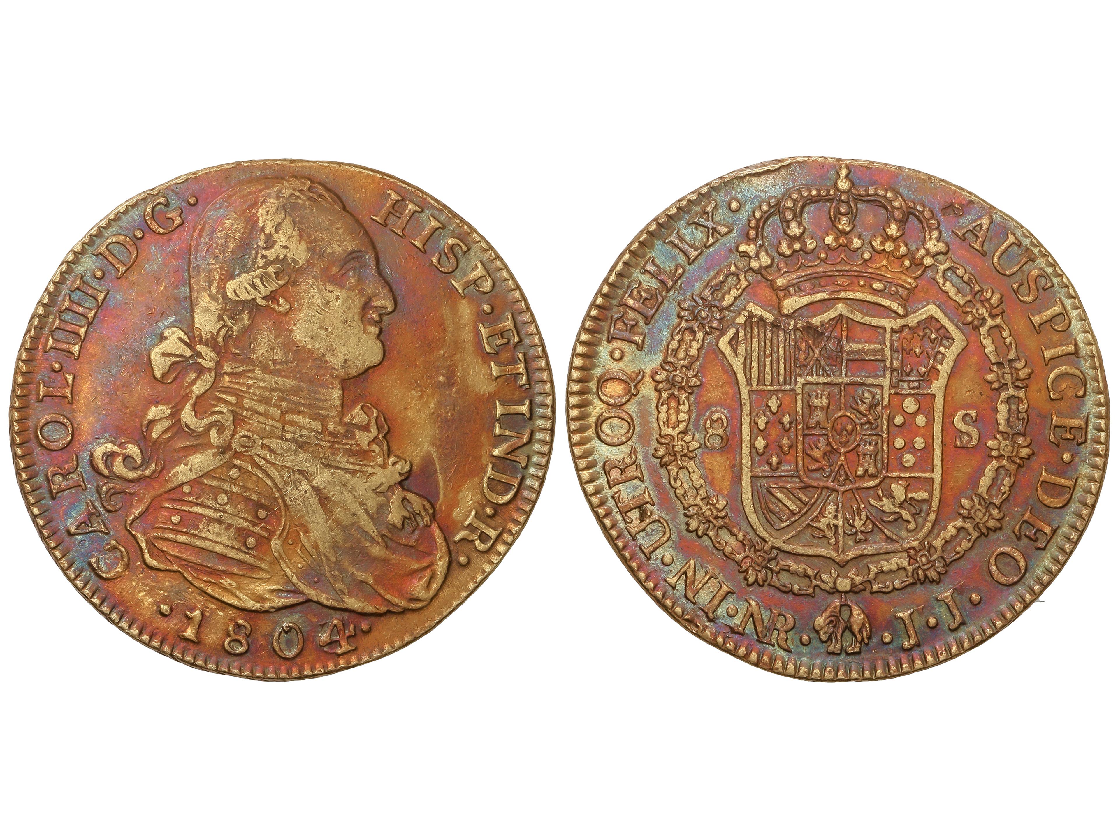 Escudos. 1804/3. NUEVO REINO. J.J. 26,93 grs. (Posiblemente descolgada). Pátina irisada. AC-1743; XC-1141. MBC. (Image1)