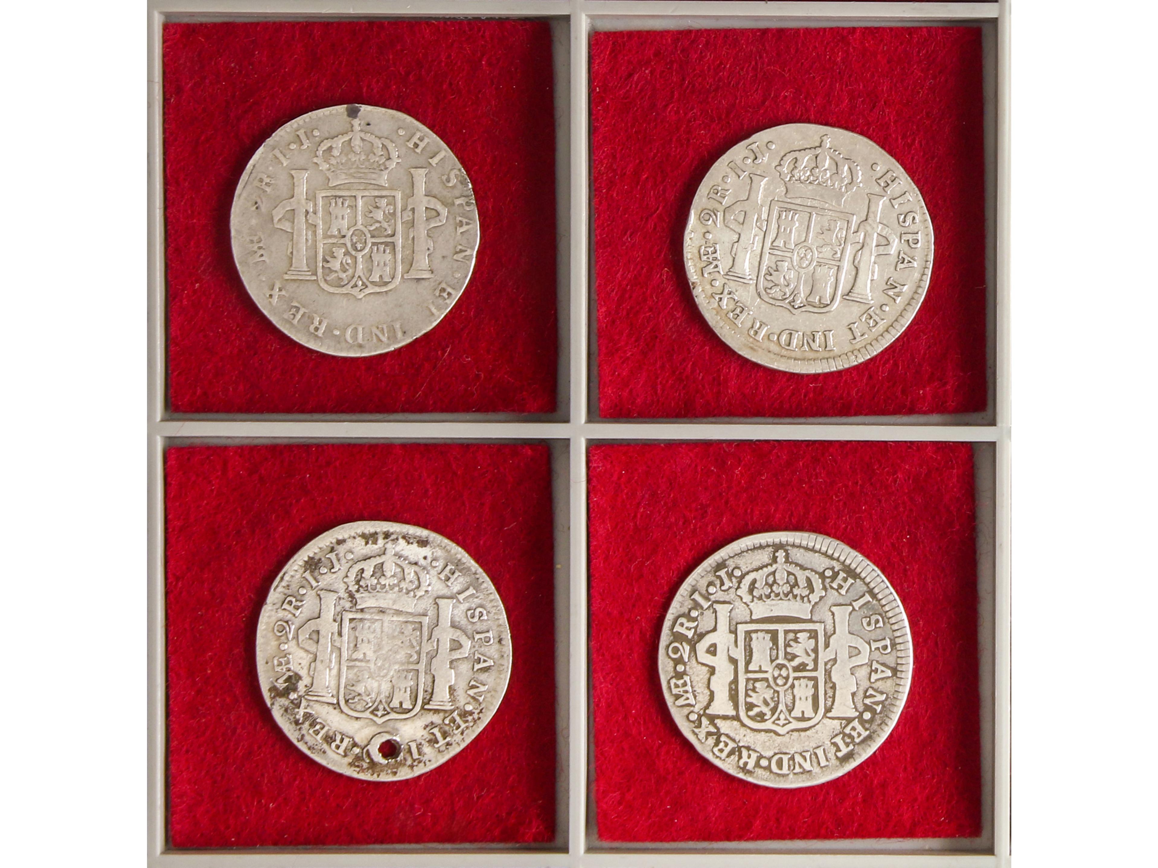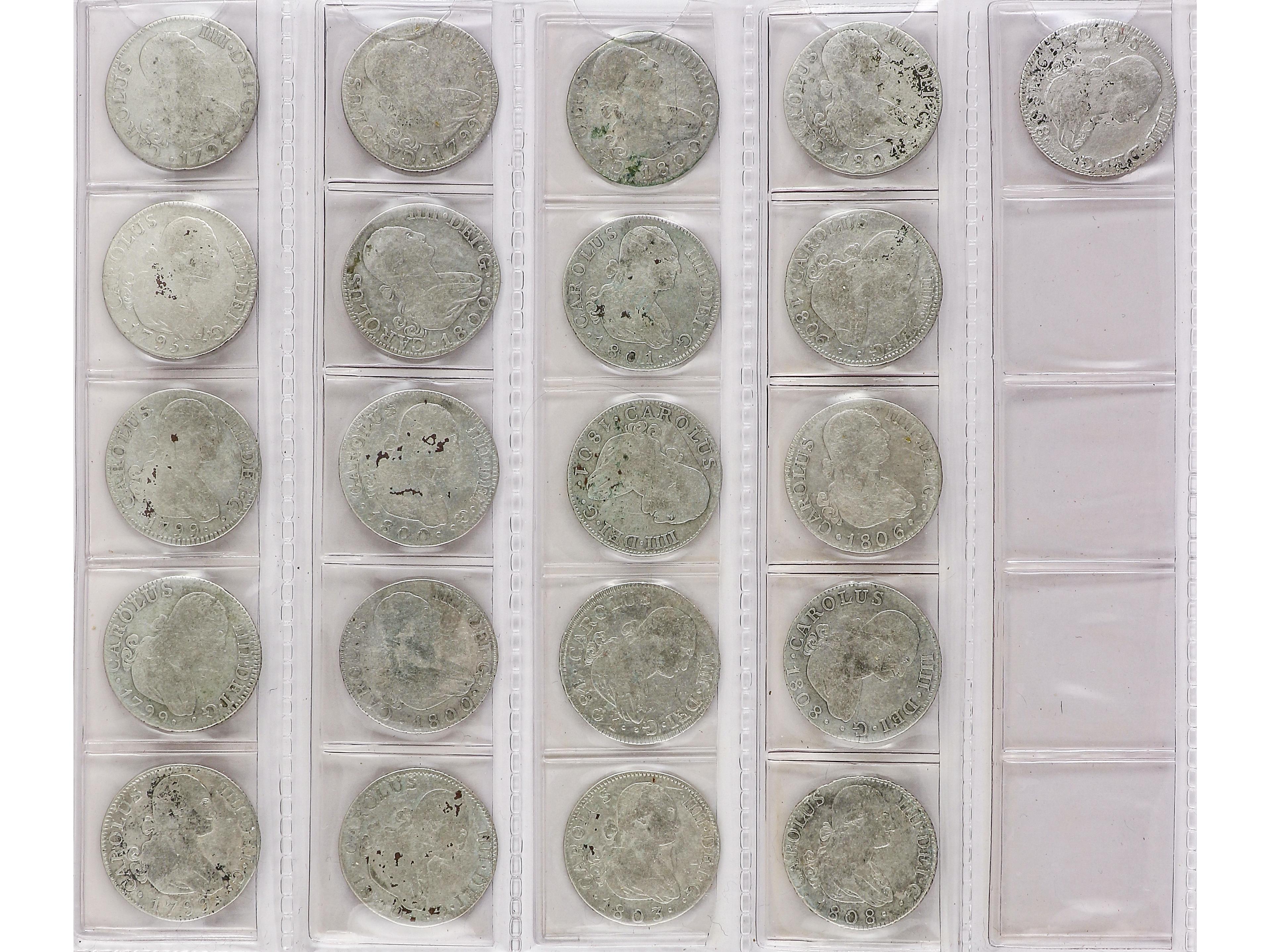 Lote 21 monedas 2 Reales. 1795 a 1808. MADRID. 1795 (2), 1799 (4), 1800 (5), 1801 (3), 1803, 1804, 1806 (2), 1808 (3). A EXAMINAR. BC a MBC-. (Image1)