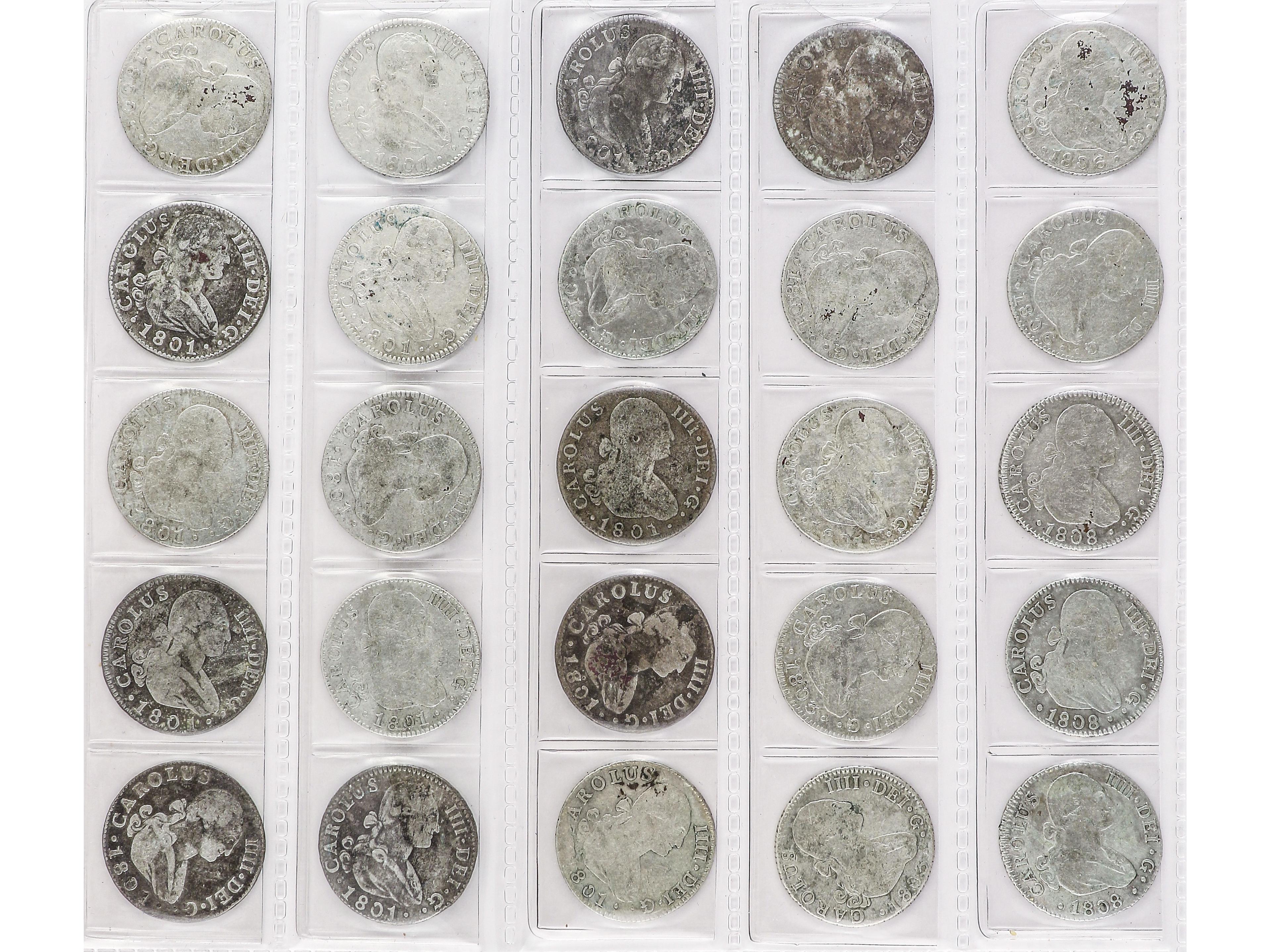 Lote 25 monedas 2 Reales. 1800 a 1808. SEVILLA. 1800, 1801 (17), 1803 (2), 1806 (2), 1808 (3). A EXAMINAR. BC a MBC-.