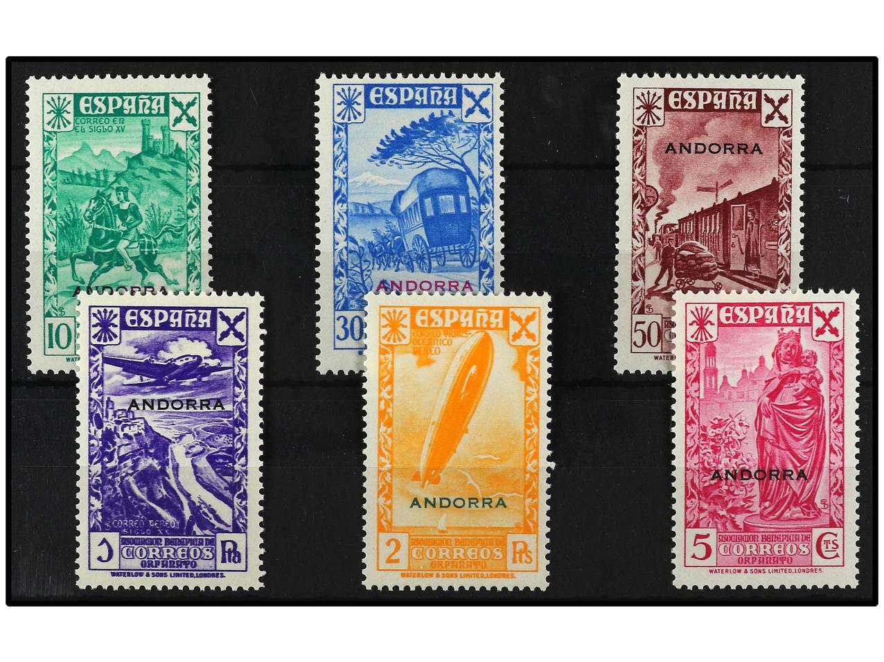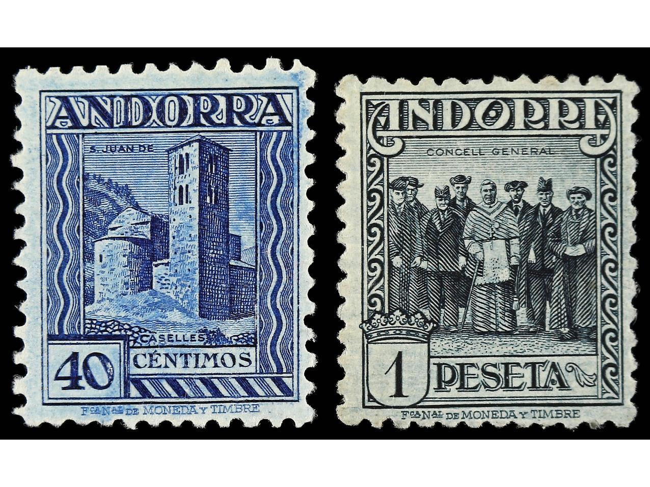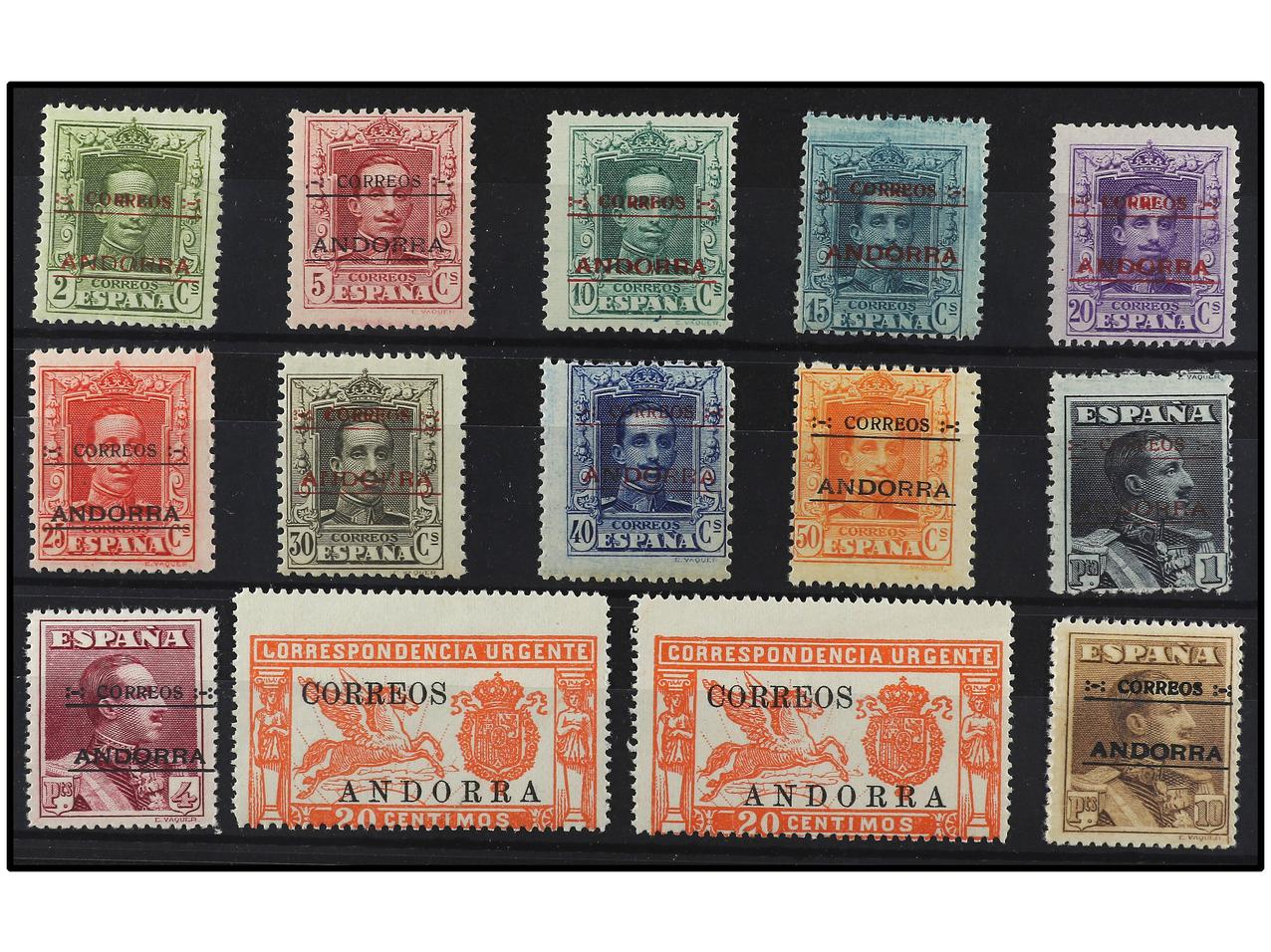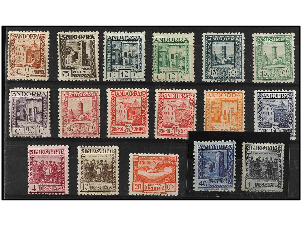 COLONIAS ESPAÑOLAS: ANDORRA. SERIE COMPLETA, 17 valores. 40 cts. de goma no original y 1 pta. manipulado. A EXAMINAR. Ed.28/44. Cat. 3.675€. (Image1)