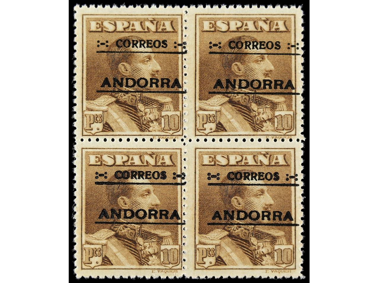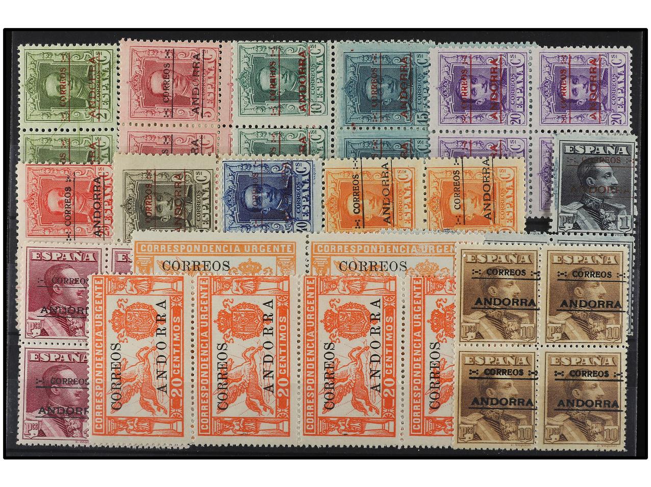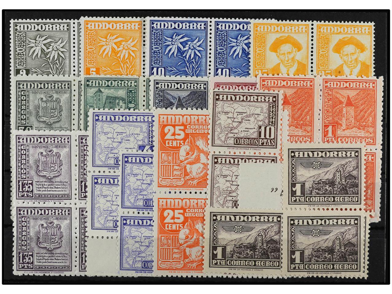 COLONIAS ESPAÑOLAS: ANDORRA. SERIE COMPLETA. 14 valores. Mayoría en bloques de cuatro. 40 cts., 50 cts. y 1 pta. numeración ceros y 4 y 10 pts. numeración privada. Ed.1/14 (4). (Image1) (Image2)