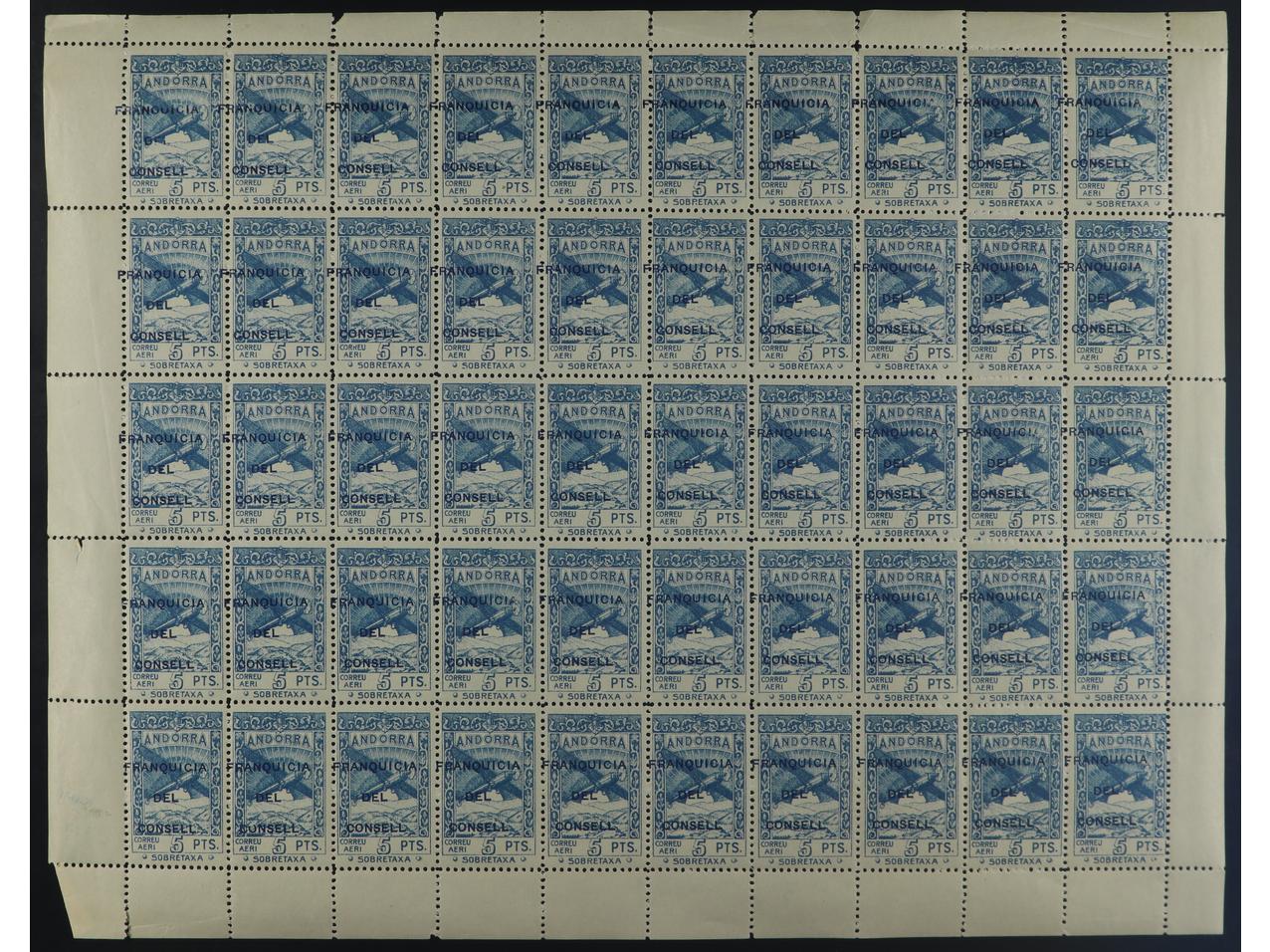 ANDORRA. 5 pts. azul. Pliego completo de 50 sellos con HAB. ALGO DESPLAZADA. Valor clave. OCASIÓN. Ed.NE36hdx(50). Cat. 3.000€. (Image1)