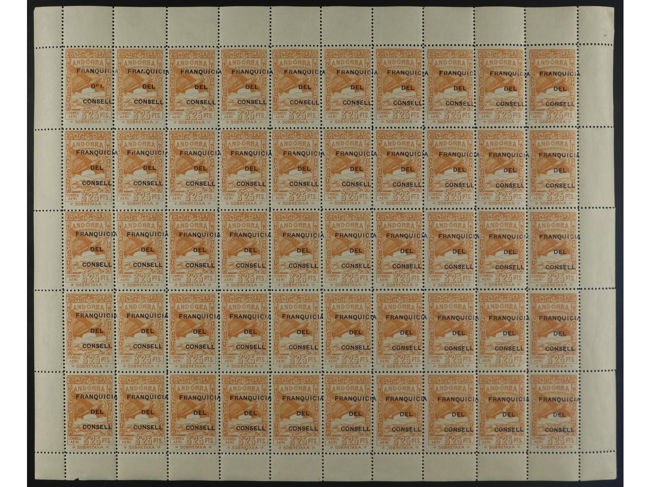 ANDORRA. 3,25 pts. naranja. Pliego completo de 50 sellos con HAB. ALGO DESPLAZADA. OCASIÓN. Ed.NE34hdx(50). Cat. 1.500€. (Image1)