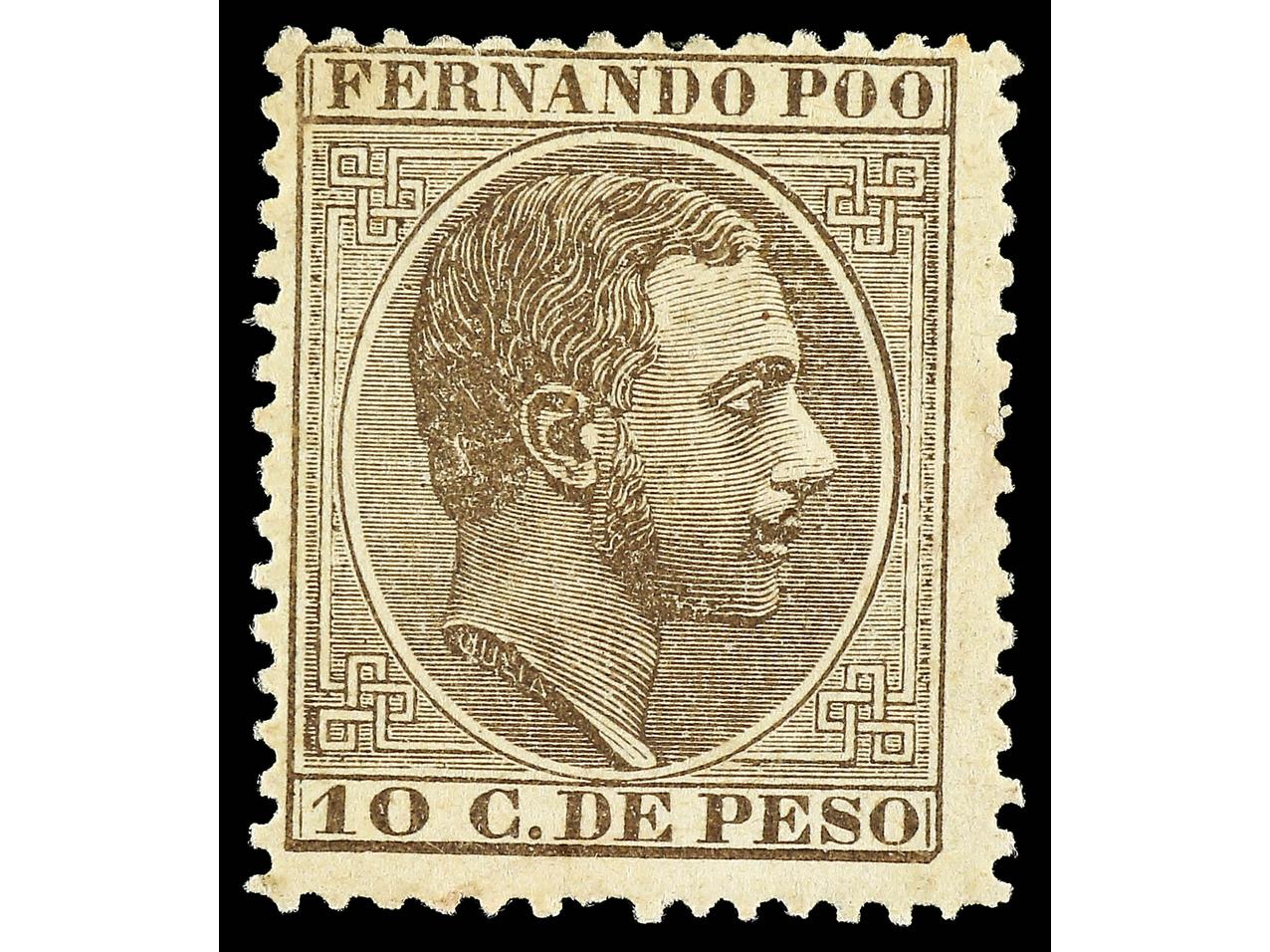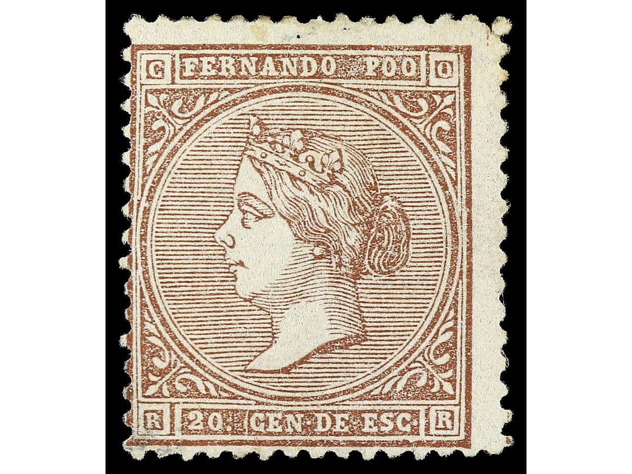 COLONIAS ESPAÑOLAS: FERNANDO POO. 20 cts. de escudo castaño. Ejemplar corriente. RARO. EXAMINAR. Ed.1. (Image1)