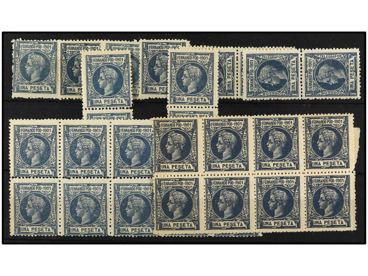 COLONIAS ESPAÑOLAS: FERNANDO POO. 1 pta. verde azulado. 30 ejemplares sueltos o en bloques. Calidad diversa. EXAMINAR. Ed.104 (30). Cat. 4.200€.