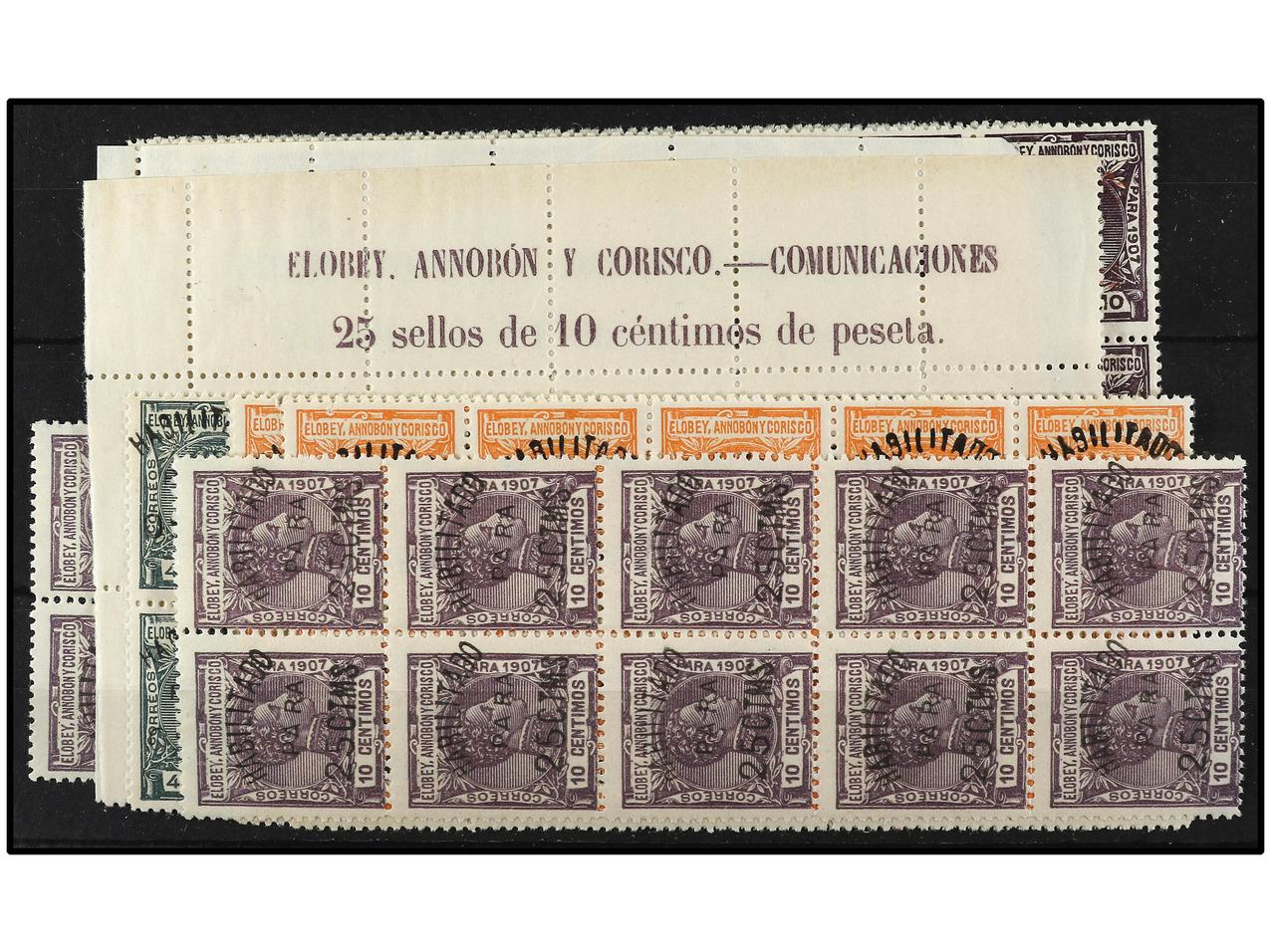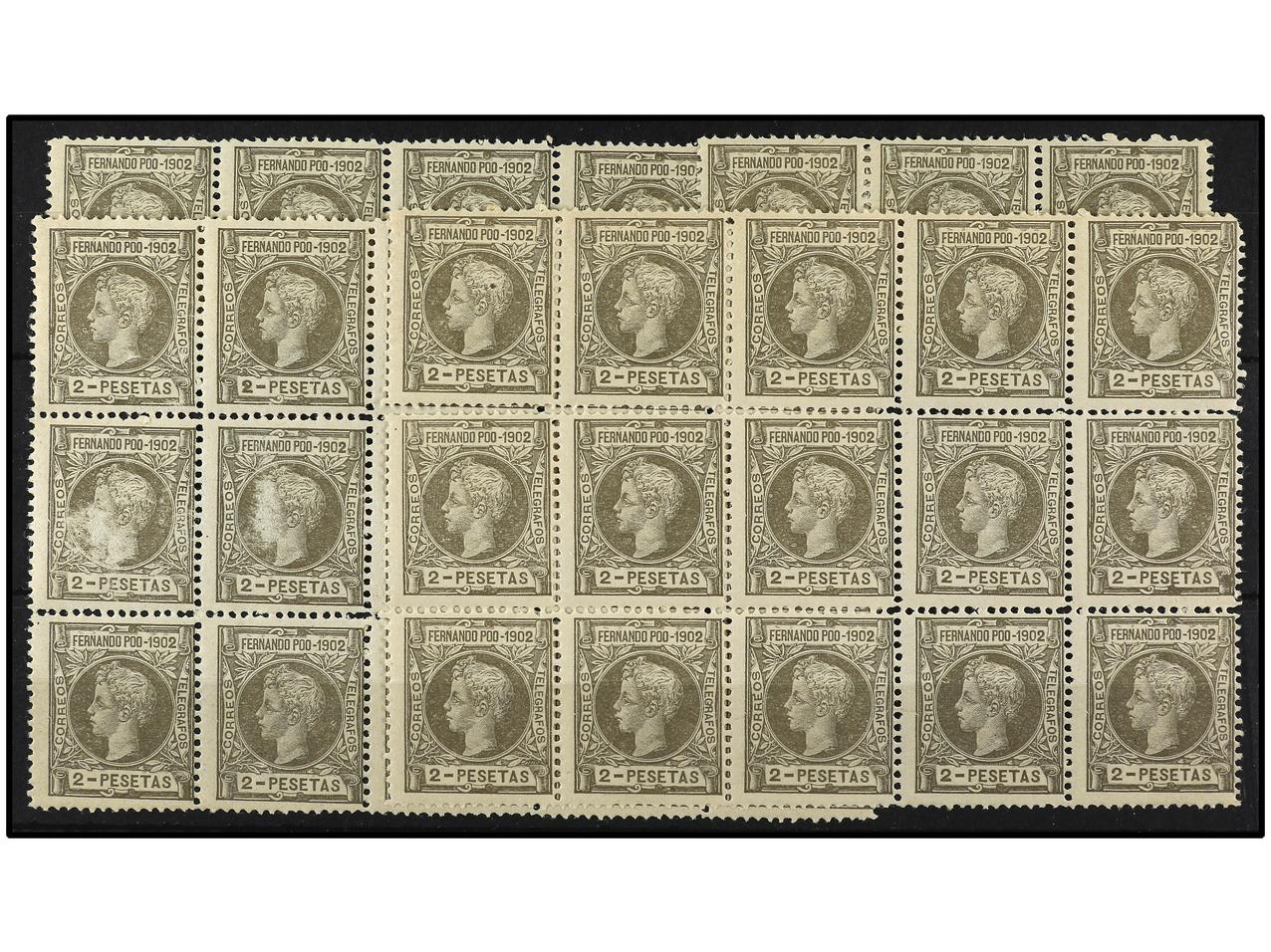 COLONIAS ESPAÑOLAS: FERNANDO POO. 2 pts. verde bronce. 38 sellos en bloques o tiras. En general buena calidad. EXAMINAR. Ed.116 (38). Cat. 2.850€.