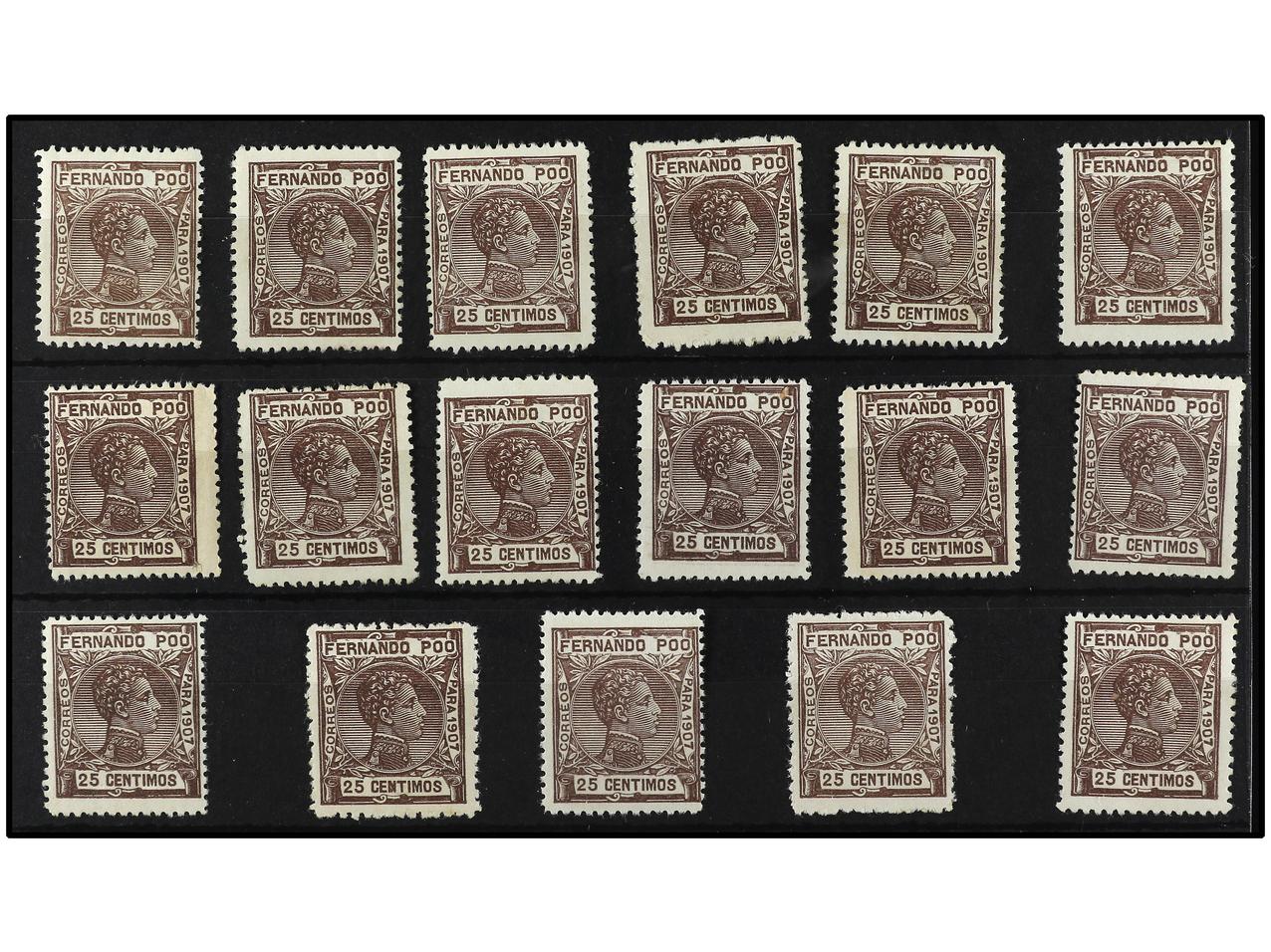 COLONIAS ESPAÑOLAS: FERNANDO POO. 25 cts. castaño. 17 sellos en calidad diversa. EXAMINAR. Ed.159 (17). Cat. 3.910€. (Image1)