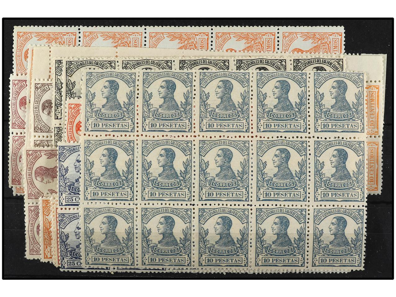 COLONIAS ESPAÑOLAS: GUINEA. 21 SERIES COMPLETAS, 13 valores mayoría en bloques. Numeraciones mezcladas. RARA sin fijasellos. Ed.85/97 (21). Cat. 2.100€.