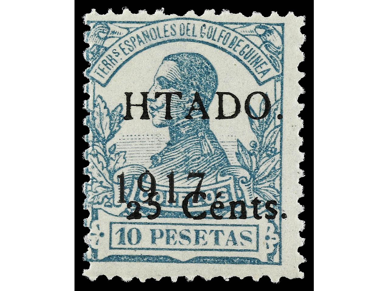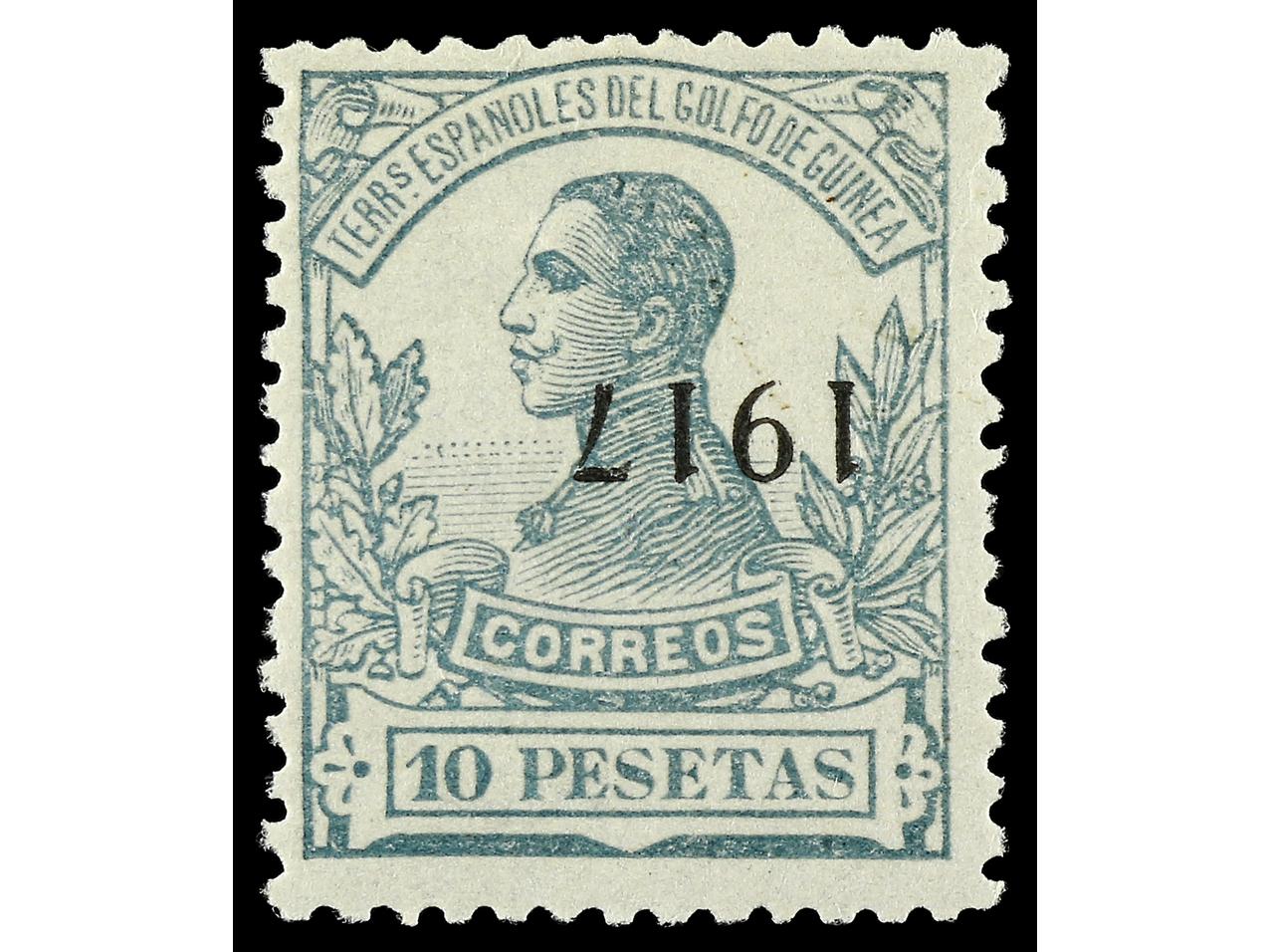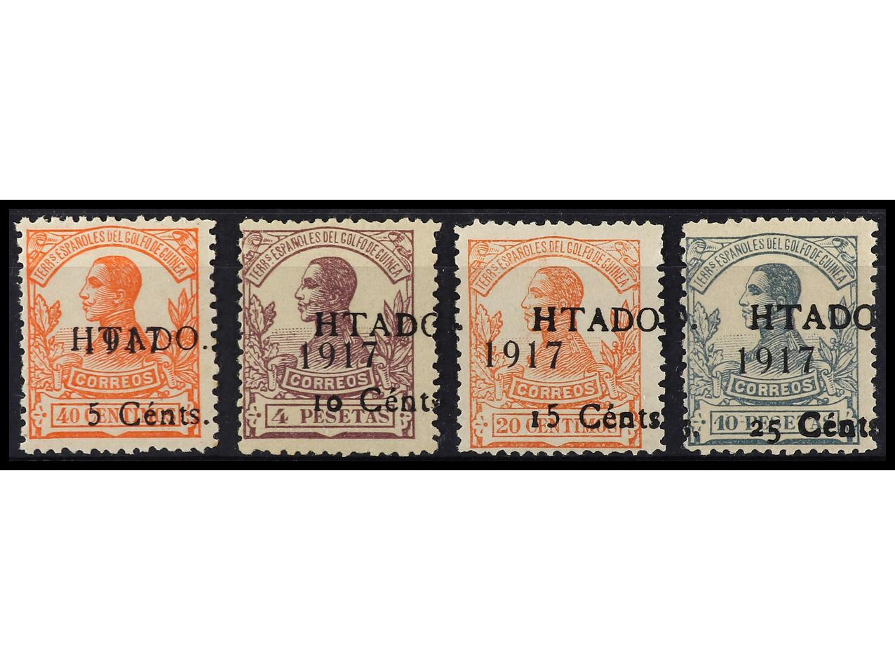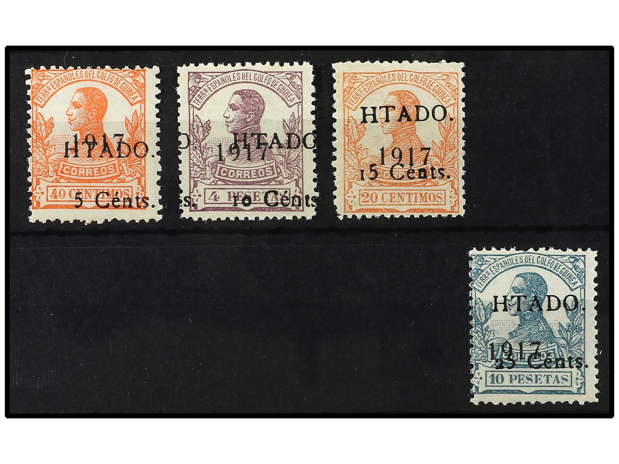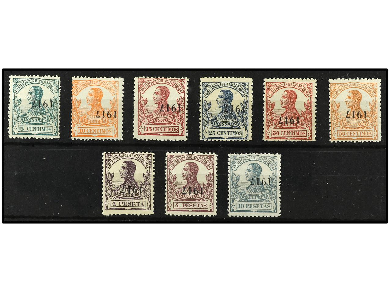 COLONIAS ESPAÑOLAS: GUINEA. SERIE COMPLETA a falta del 20 y 40 cts. 9 valores con habilitación INVERTIDA. Muy bonita y rara. Ed.113/23hi sin 116 y 119hi. Cat. 561€. (Image1) (Image2)