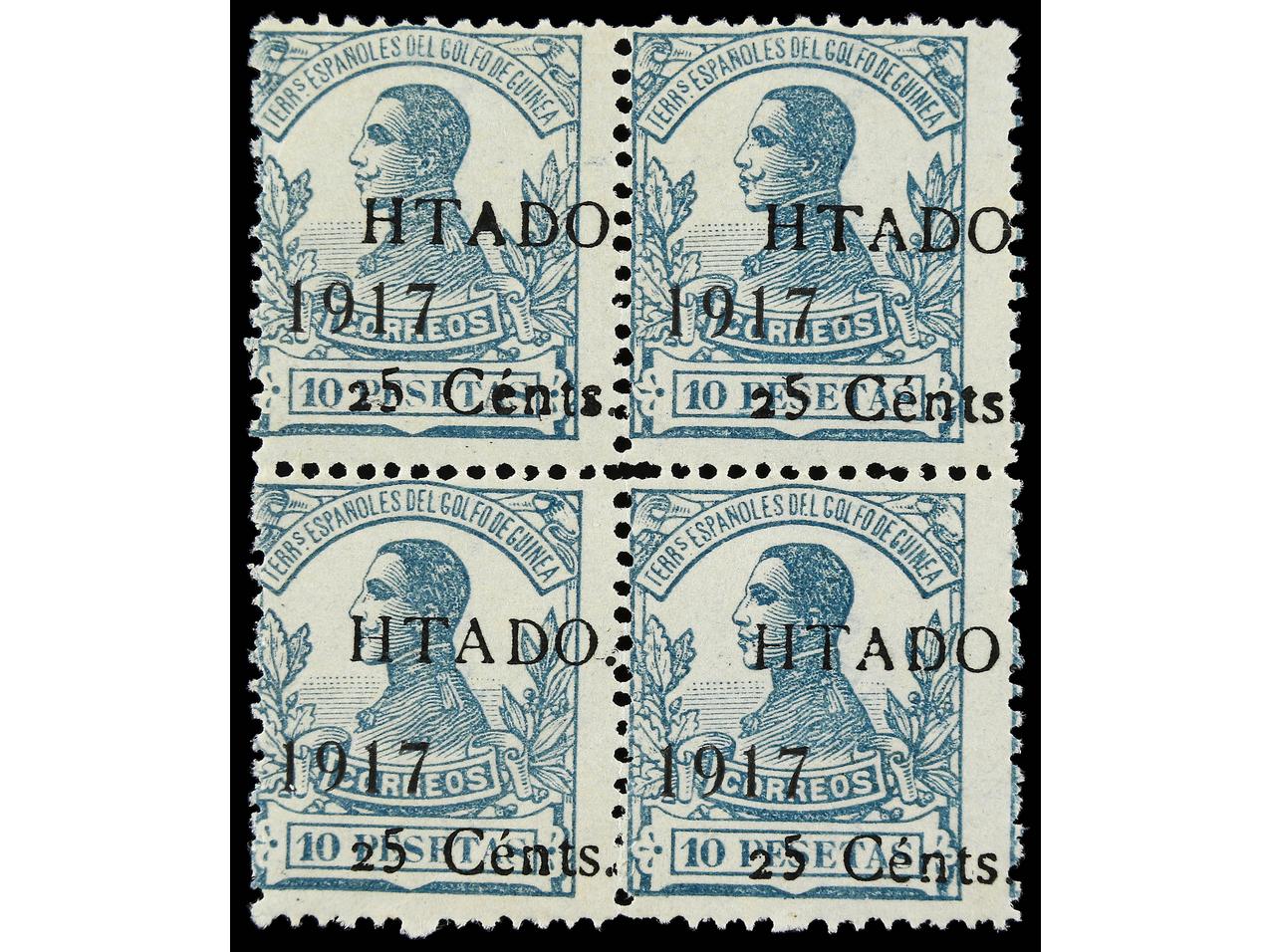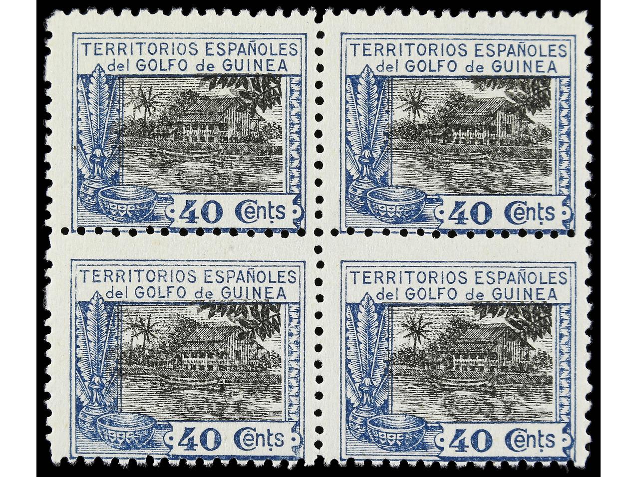 COLONIAS ESPAÑOLAS: GUINEA. 40 céntimos azul y negro. DOBLE IMPRESIÓN DEL CENTRO. Bloque de cuatro. Ed.173ed. Cat. 592€. (Image1)