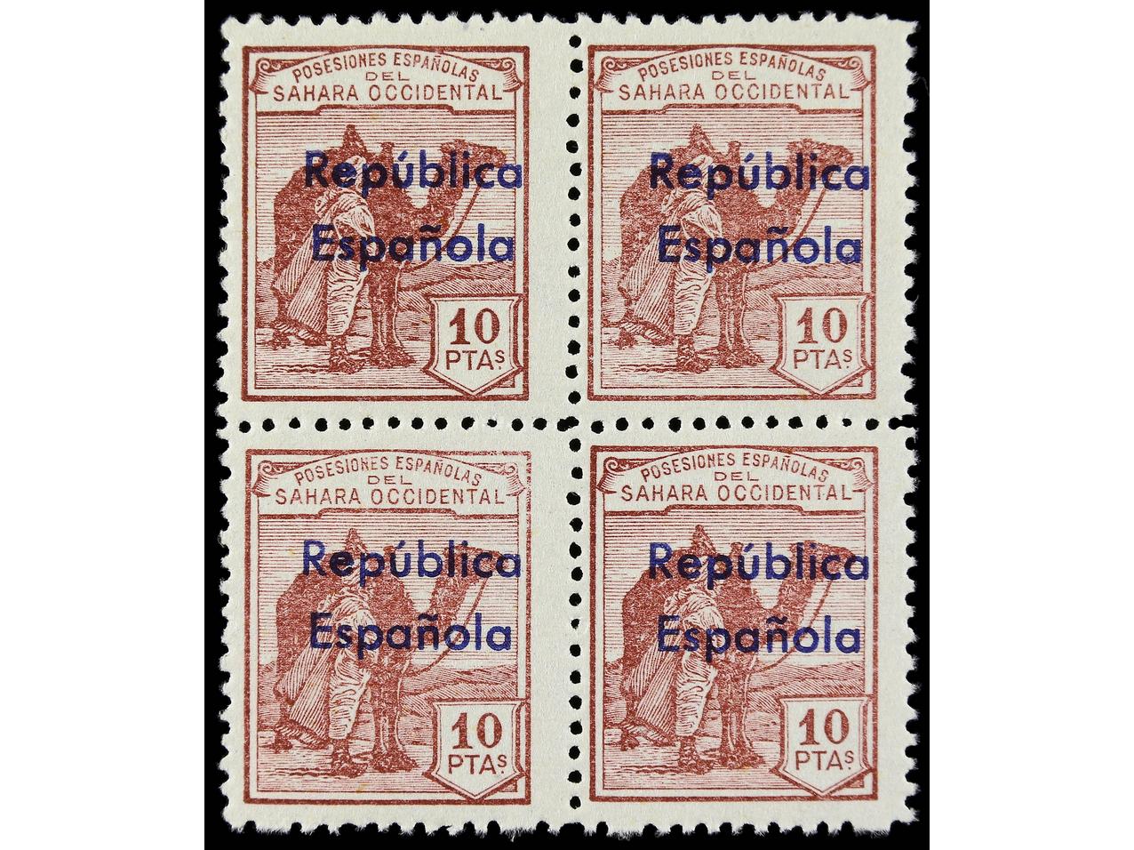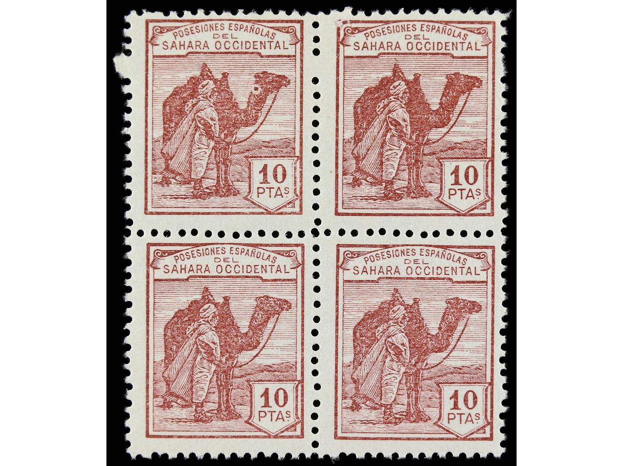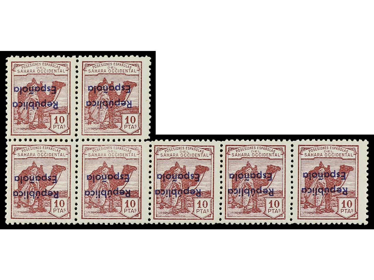 COLONIAS ESPAÑOLAS: SAHARA. 10 pts. carmín violeta. Bloque de 7 con HABILITACIÓN INVERTIDA. Algún valor con pliegue. EXAMINAR. Ed.47Bhi (7). Cat. 2.170€.