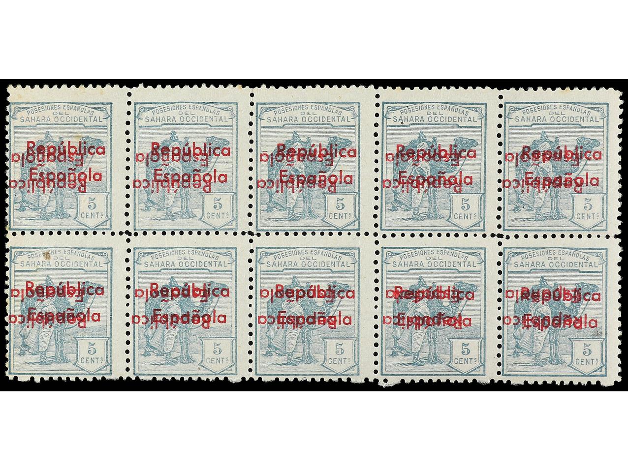 COLONIAS ESPAÑOLAS: SAHARA. 5 cts. verde claro. Bloque de 10 con HABILITACIÓN DOBLE, UNA INVERTIDA. En general buena calidad. EXAMINAR. Ed.36Bhhi (10). Cat. 1.250€. (Image1)