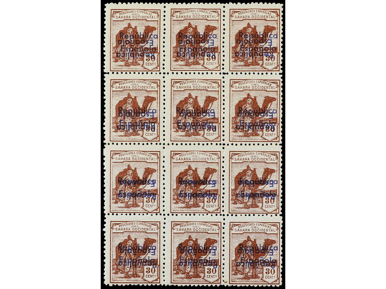 COLONIAS ESPAÑOLAS: SAHARA. 30 cts. castaño rojizo. Bloque de 12 con HABILITACIÓN DOBLE, UNA INVERTIDA. Buena calidad. Ed.41Bhhi (12). Cat. 1.500€.