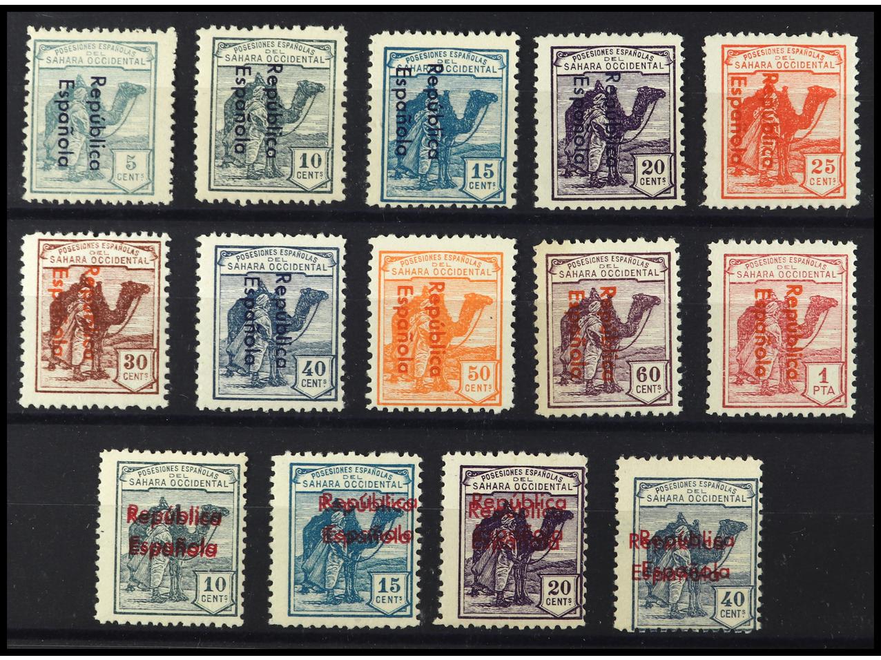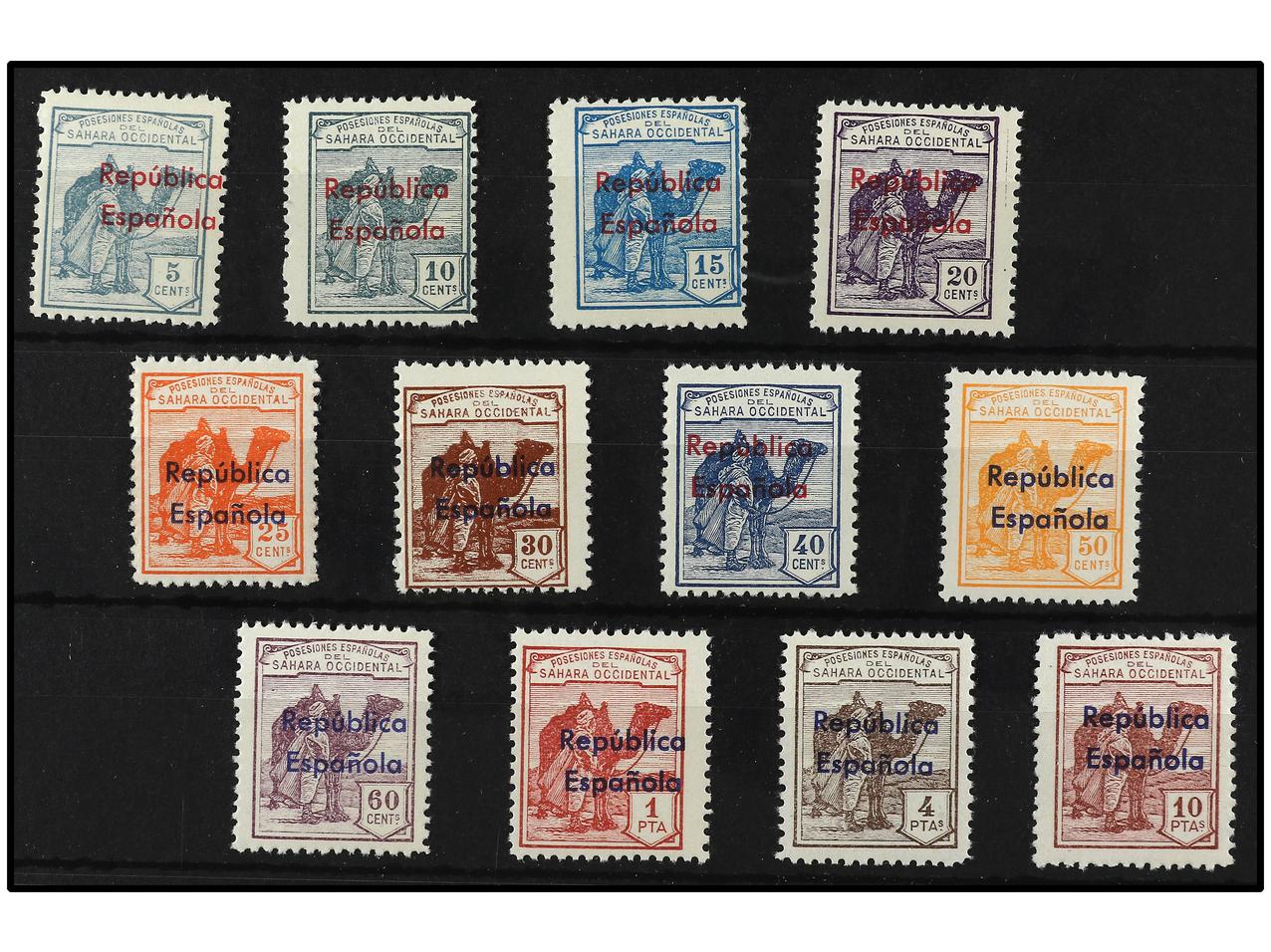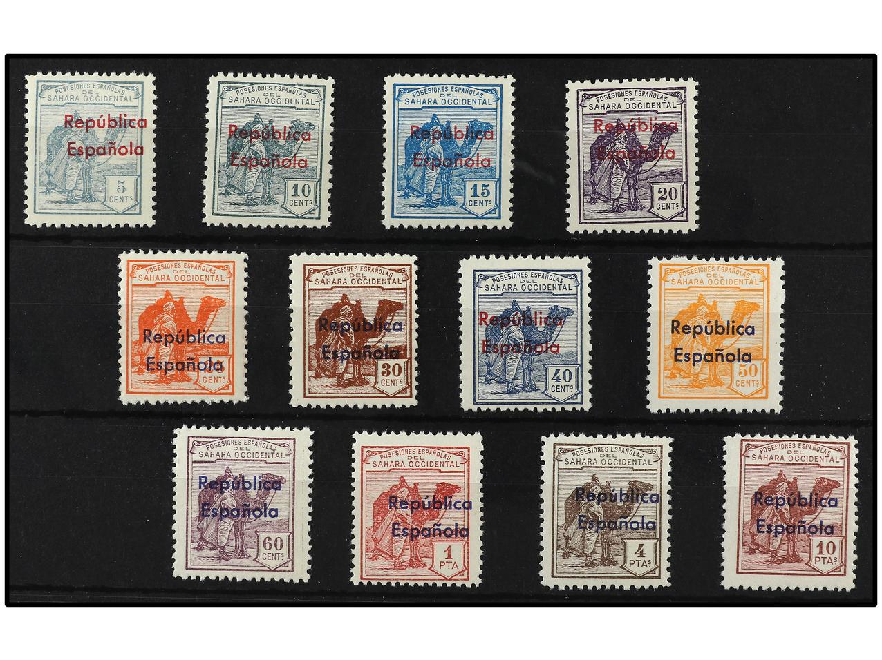 COLONIAS ESPAÑOLAS: SAHARA. SERIE COMPLETA, 12 valores. Habilitación horizontal. 9 series y una de ellas a falta de un sello de 5 c. valor de 10 pts., 5 sellos fallo de goma. Ed.36B/47B. Cat. 5.550€. (Image1) (Image2)