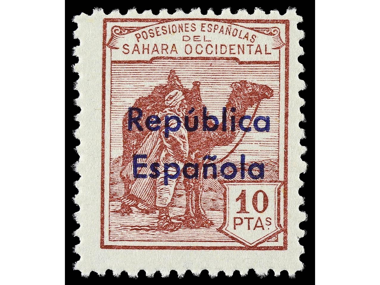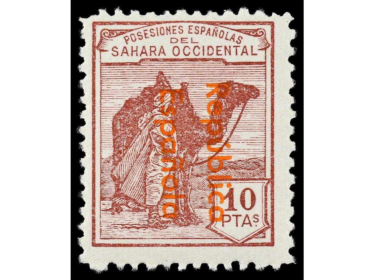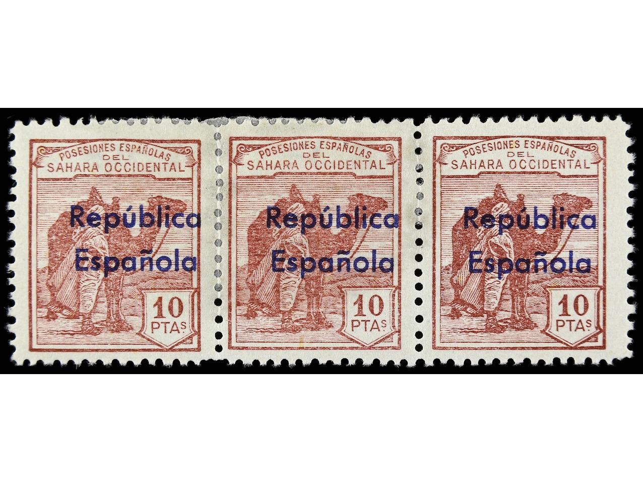 COLONIAS ESPAÑOLAS: SAHARA. SERIE COMPLETA, 12 valores. Habilitación horizontal. 9 series y una de ellas a falta de un sello de 5 c. valor de 10 pts., 5 sellos fallo de goma. Ed.36B/47B. Cat. 5.550€. (Image1) (Image2)