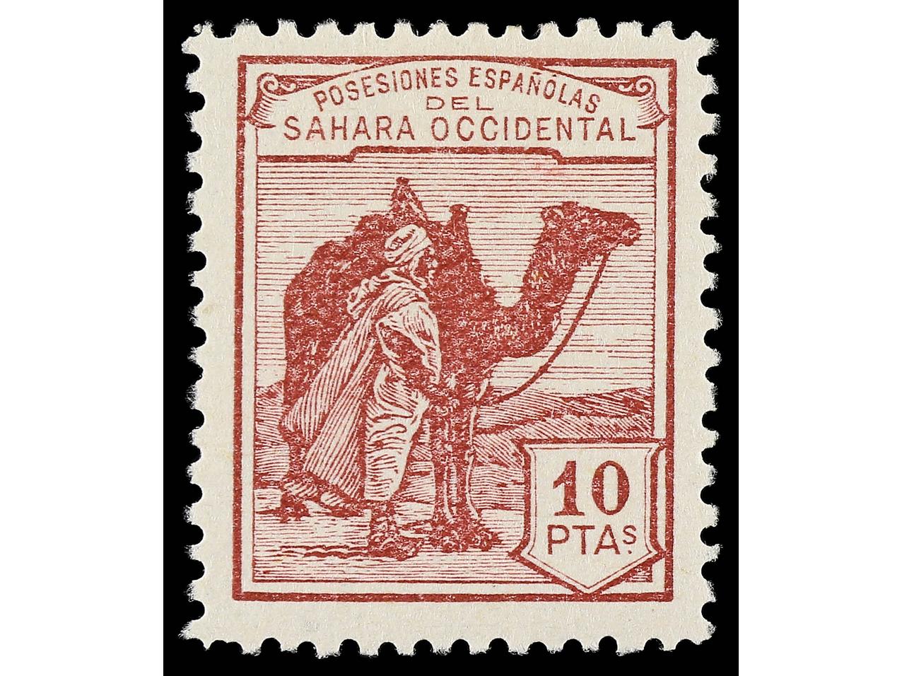 COLONIAS ESPAÑOLAS: SAHARA. 10 pts. carmín violeta. 9 sellos, uno con punto de aguja. Numeración ceros. Ed.12N (9). Cat. +3.000€. (Image1) (Image2)