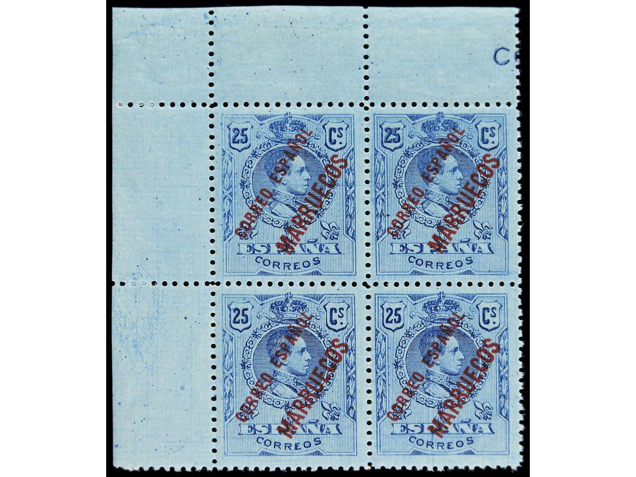 COLONIAS ESPAÑOLAS: TANGER. 25 c. azul. No expendido. Bloque de cuatro. Ed.NE 1. Cat. 520€. (Image1)