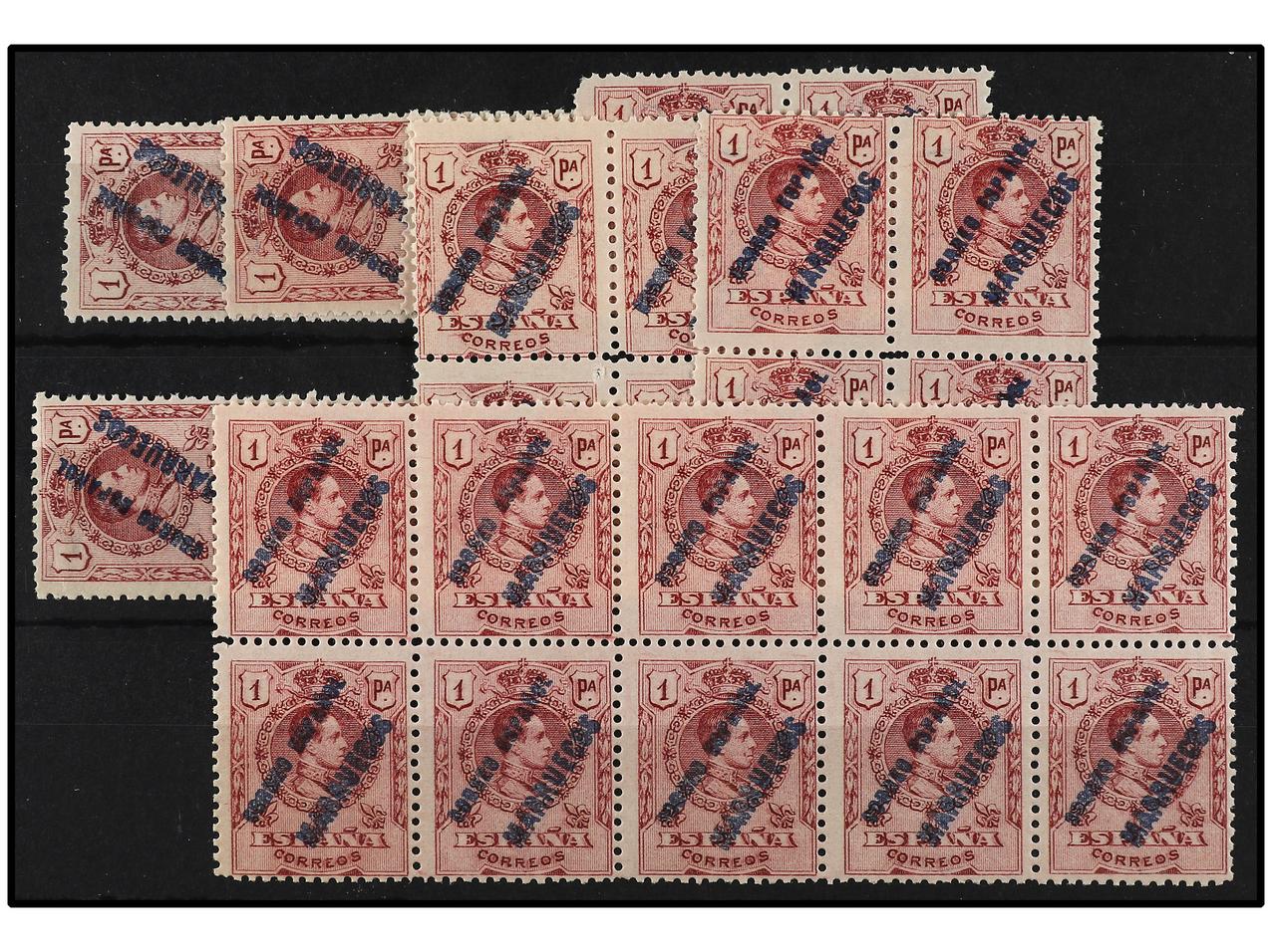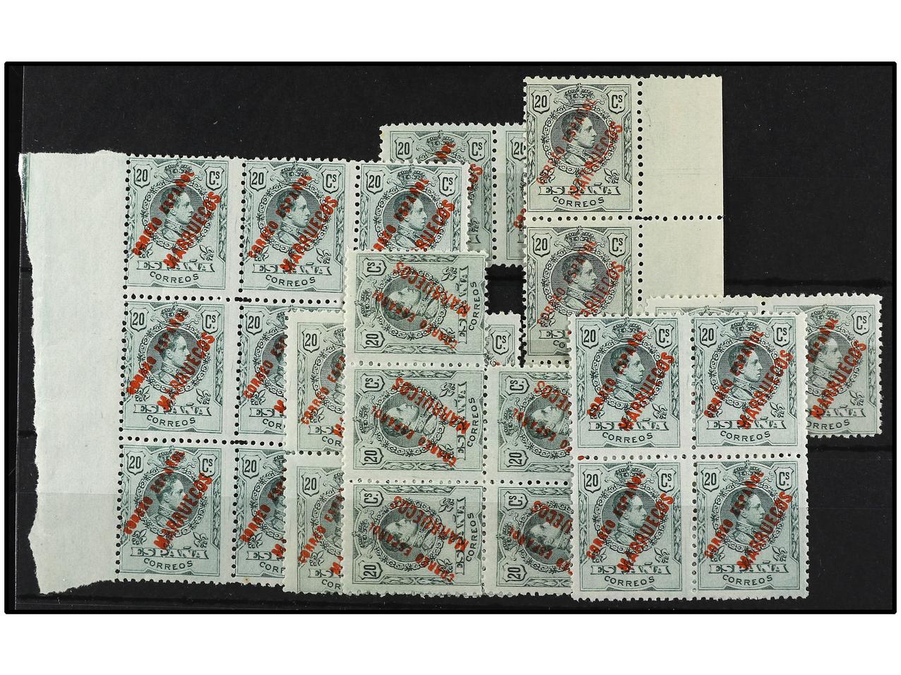 COLONIAS ESPAÑOLAS: TANGER. 1 peseta carmín. 30 sellos en bloques. Hay bien centrados. Ed.9. Cat. 3.000€. (Image1)