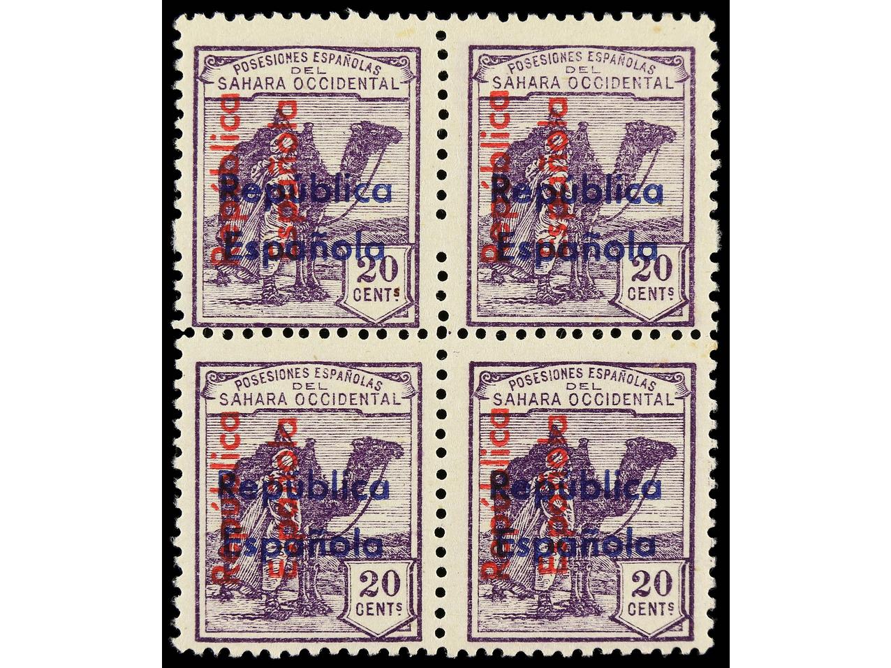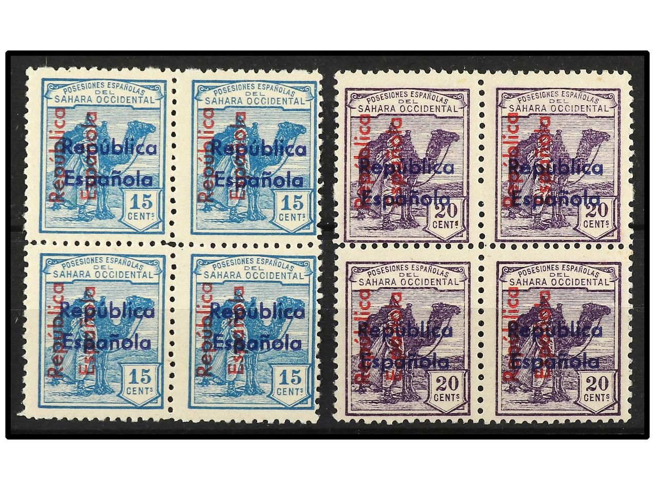 COLONIAS ESPAÑOLAS: SAHARA. 15 y 20 cts. en BLOQUES DE CUATRO con DOBLE HABILITACIÓN VERTICAL de abajo a arriba en rojo o carmín y HORIZONTAL en azul. MUY RARO. OCASIÓN. EXAMINAR. Ed.38D y 39D (4). Cat. +2.400€. (Image1) (Image2)