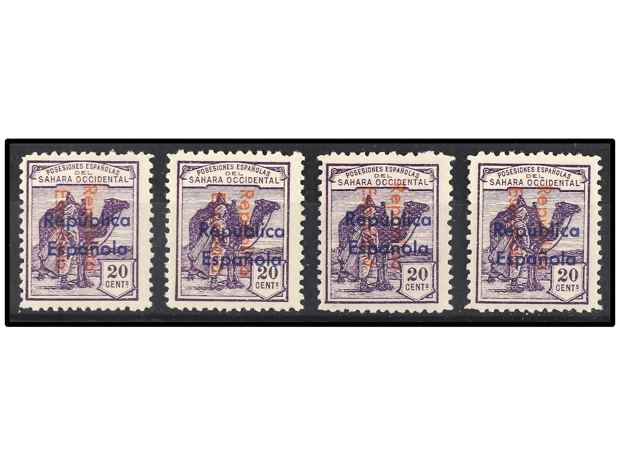 COLONIAS ESPAÑOLAS: SAHARA. 20 cts. violeta. HABILITACIÓN VERTICAL DE ARRIBA A ABAJO EN ROJO y HORIZONTAL EN AZUL. RAROS. 4 ejemplares. OCASIÓN. Ed.39Db (4). Cat. +1.600€. (Image1)