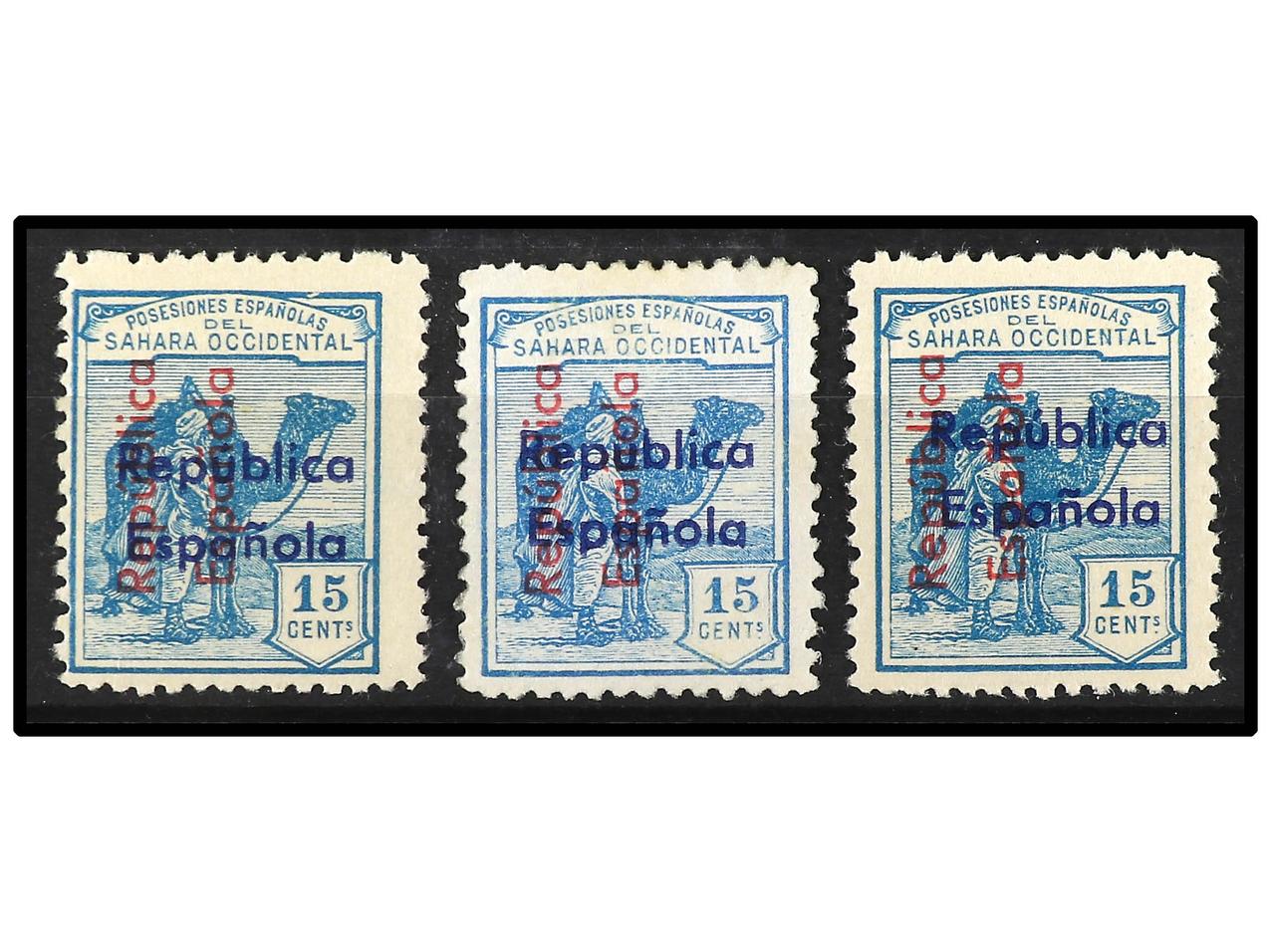 COLONIAS ESPAÑOLAS: SAHARA. 15 cts. verde azulado. HABILITACION VERTICAL DE ABAJO A ARRIBA EN CARMÍN y HORIZONTAL EN AZUL. 3 sellos, 2 con fijasellos. OCASIÓN. Ed.38D (3). Cat. +600€. (Image1)