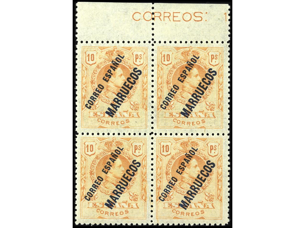 COLONIAS ESPAÑOLAS: TANGER. 10 pts. naranja en bloque de 4 con borde superior de hoja. Bien centrado. PRECIOSO. RARO. OCASIÓN. Ed.NE3(4). Cat. +520€.