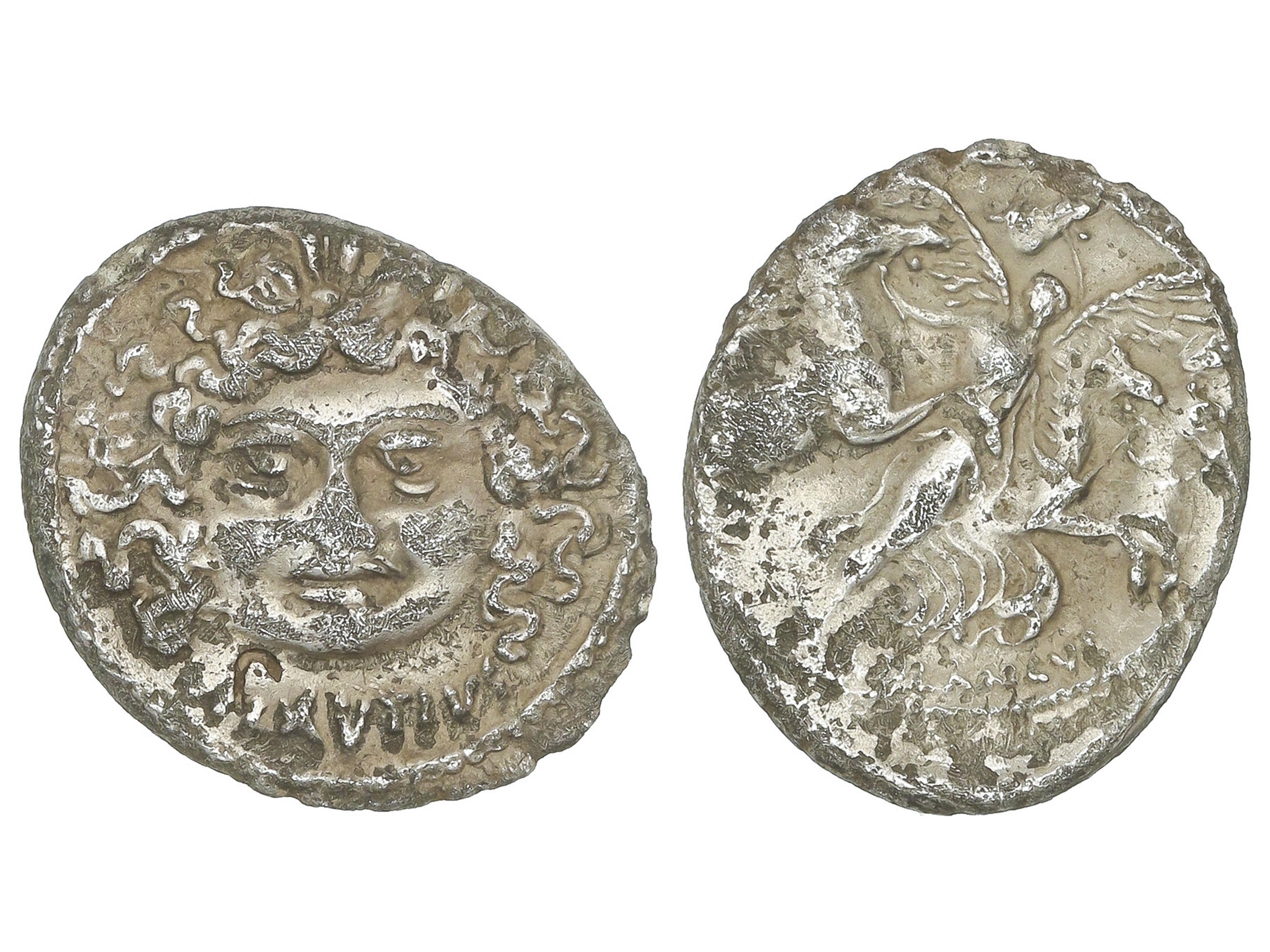 7 imageDenario. 47 a.C. PLAUTIA. L. Plautius Plancus. Anv.: Máscara de la Medusa con serpientes a ambos lados de la cara, debajo L. PLAVTIVS. Rev.: La Aurora volando y dirigiendo a los cuatro caballos del carro del Sol, debajo PLANCVS. 3,52 grs. AR. (Oxidaciones y marca de cambista en anverso a las 7h). ESCASA. BMC-4004; Cal-1131; Craw-453/1a; FFC-1003; Se-15. MBC. (Image1)