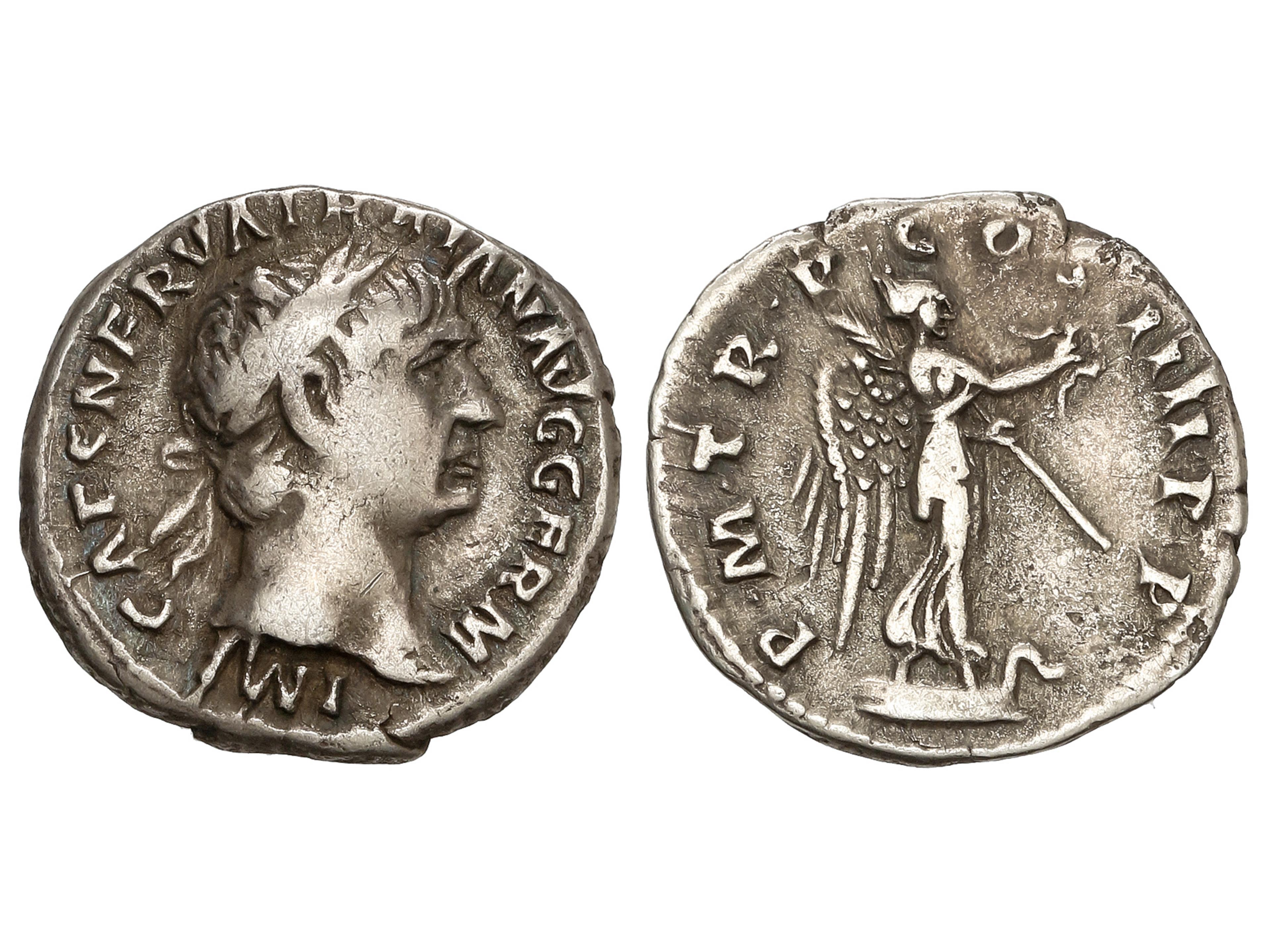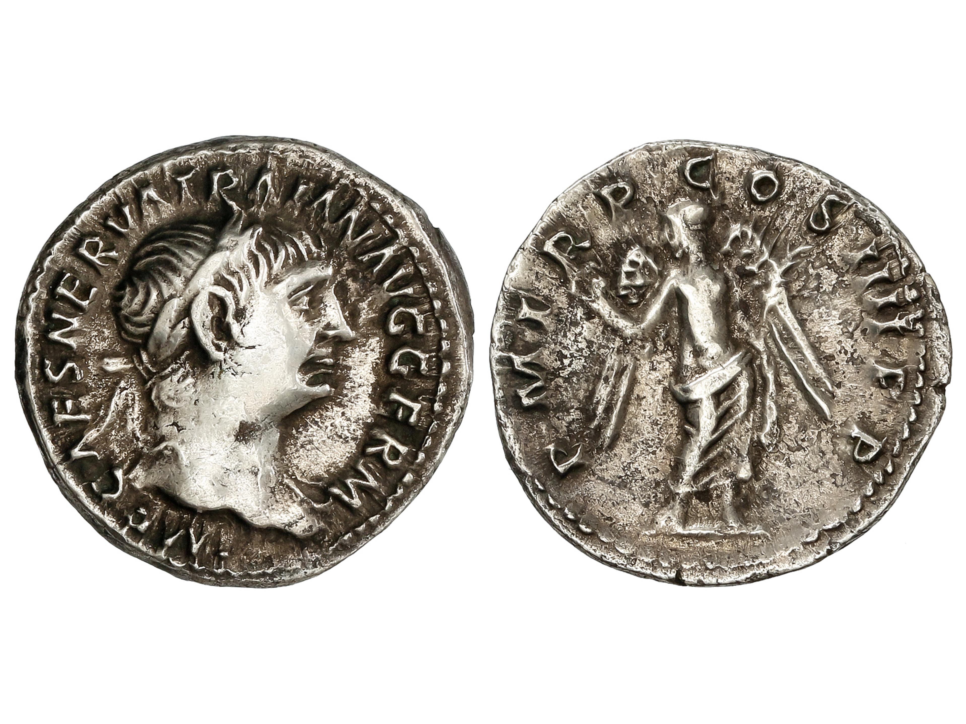 9 imageDenario. 98-111 d.C. TRAJANO. Anv.: IMP. CAES. NERVA TRAIAN. AVG. GERM. Cabeza laureada a derecha. Rev.: P.M. TR. P. COS. IIII. P. P. Victoria en pie a a izquierda con palma y laurea. 2,89 grs. AR. C-240; RIC-58; BMC-115. MBC. (Image1)