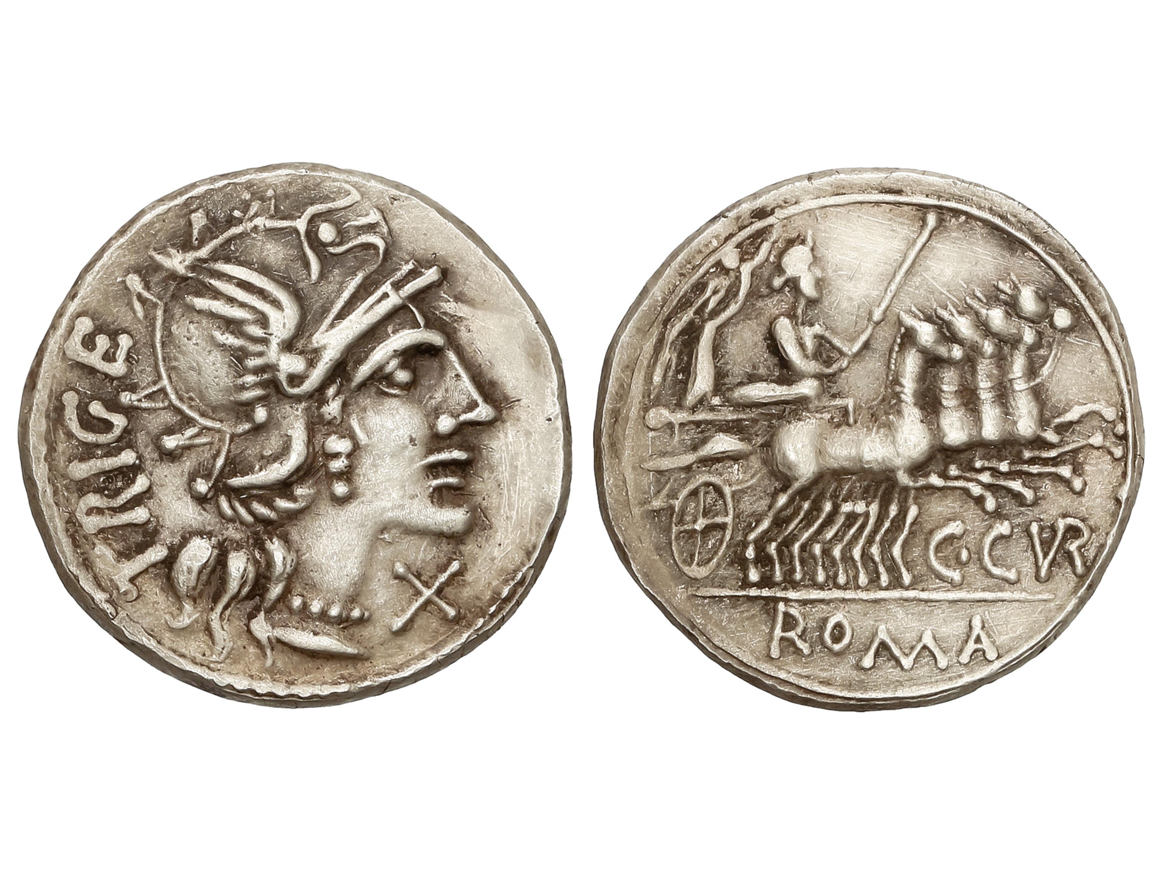 6 imageDenario. 142 a.C. CURIATIA. Caius Curiatius Trigeminus. Anv.: Cabeza de Roma a derecha, detrás TRIGE. Rev.: Juno en cuadriga a derecha., debajo C.CVR. En exergo ROMA. 3,76 grs. AR. (Algo limpiada). BMC-891; Cal-531; Craw-223-1; FFC-666; Se-1. MBC+. (Image1)