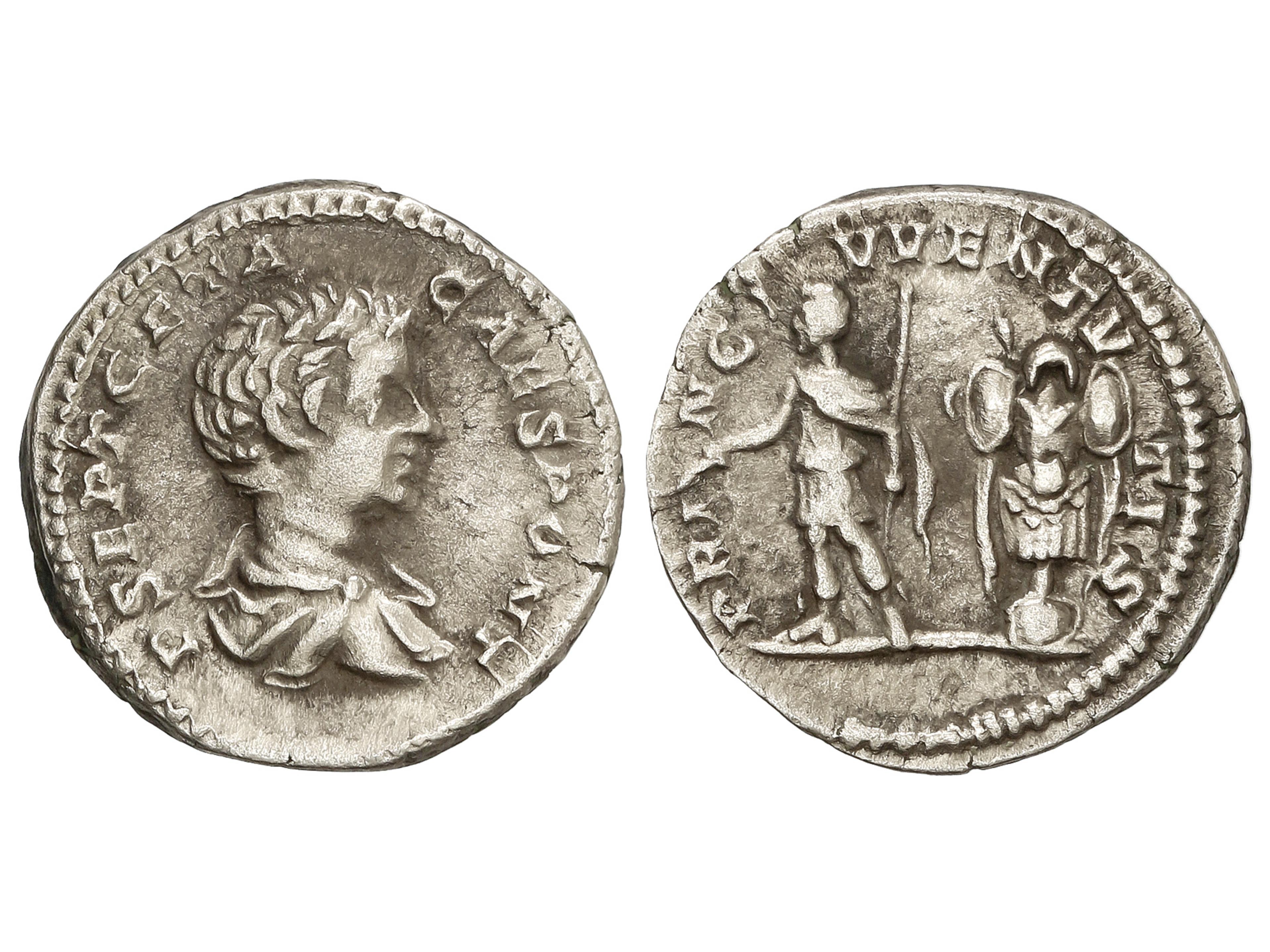13 imageDenario. 199-202 d.C. GETA. Anv.: P. SEPT. GETA. CAES. PONT. Busto infantil a derecha. Rev.: PRINC. IVVENTVTIS. Geta en pie a izquierda, detrás trofeo. 3,22 grs. AR. (Oxidaciones limpiadas). C-157b; RIC-18; BMC-234. MBC. (Image1)